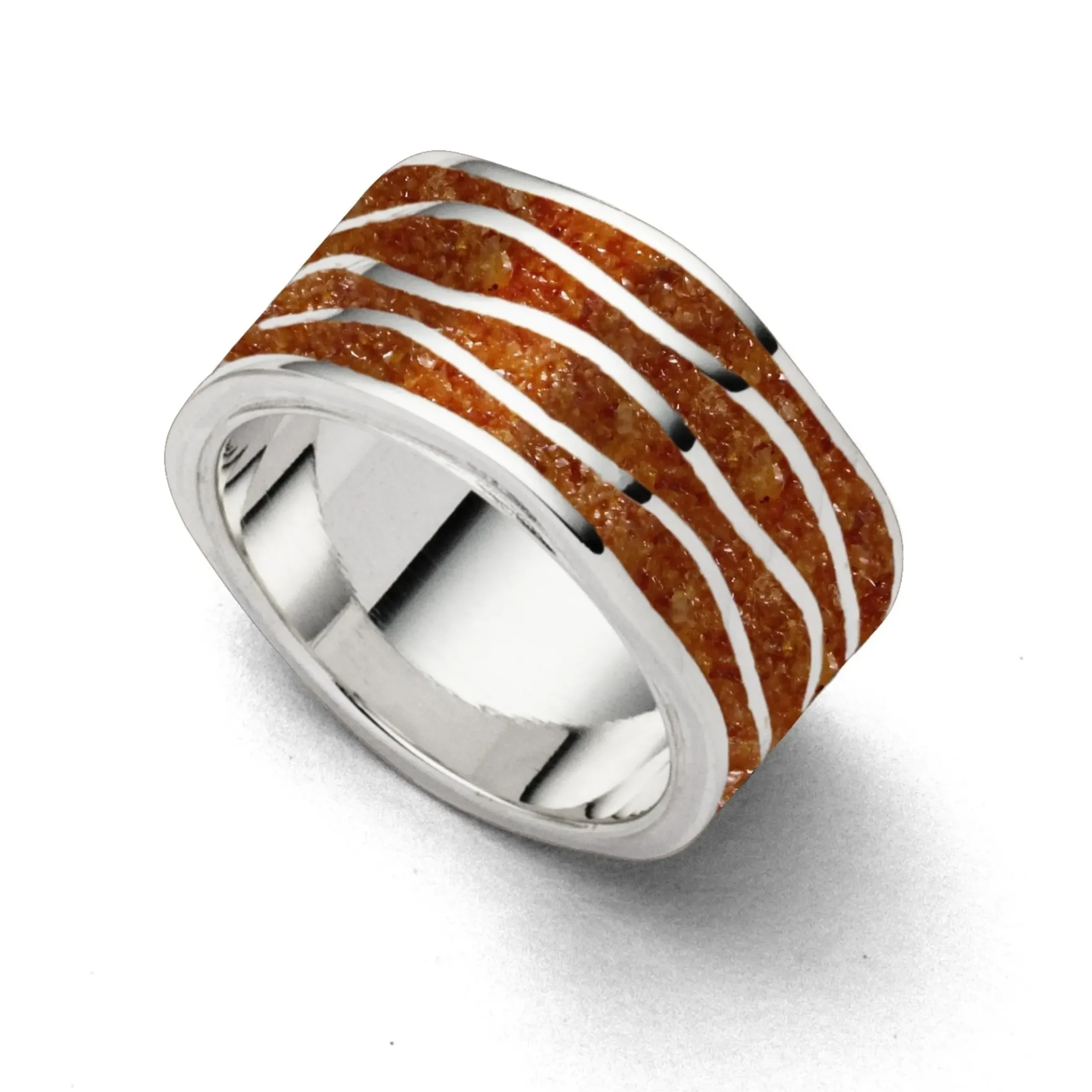 Breiter Bandring „Strandwellen“, mit einem in Bernstein eingelegten Wellenmuster. Gefertigt aus rhodiniertem 925er Sterling-Silber. Durch die Rhodinierung ist das Schmuckstück anlaufgeschützt.
