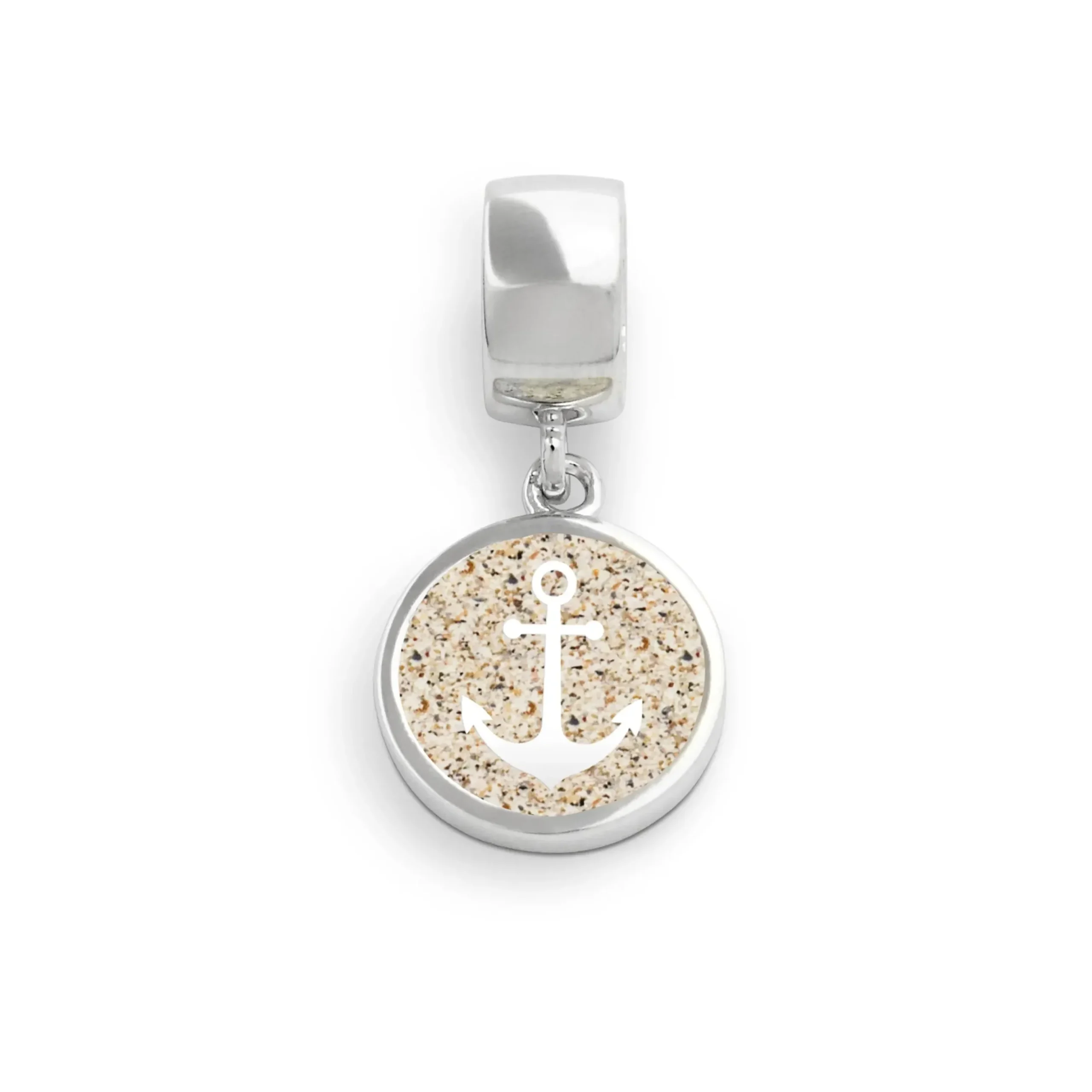 Runder Charm „Anker 2.0“ mit silbernem Anker Motiv, eingebettet in Strandsand und gefasst in rhodiniertem 925er Sterlingsilber. Zu kombinieren mit A 1134 in verschiedenen Längen.