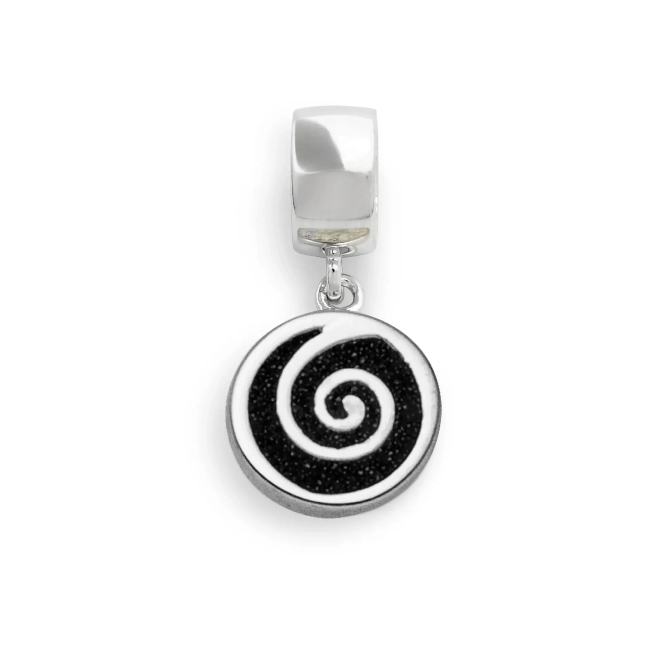 Dieser kleine aber dennoch aussagekräftige Charm-Anhänger mit silbernem Motiv (Herz, Möwe, Kompass, Anker, Muschel, Stern und Spirale) gefüllt mit echtem Lavasand und gefaßt in rhodiniertem 925/- Sterlingsilber.