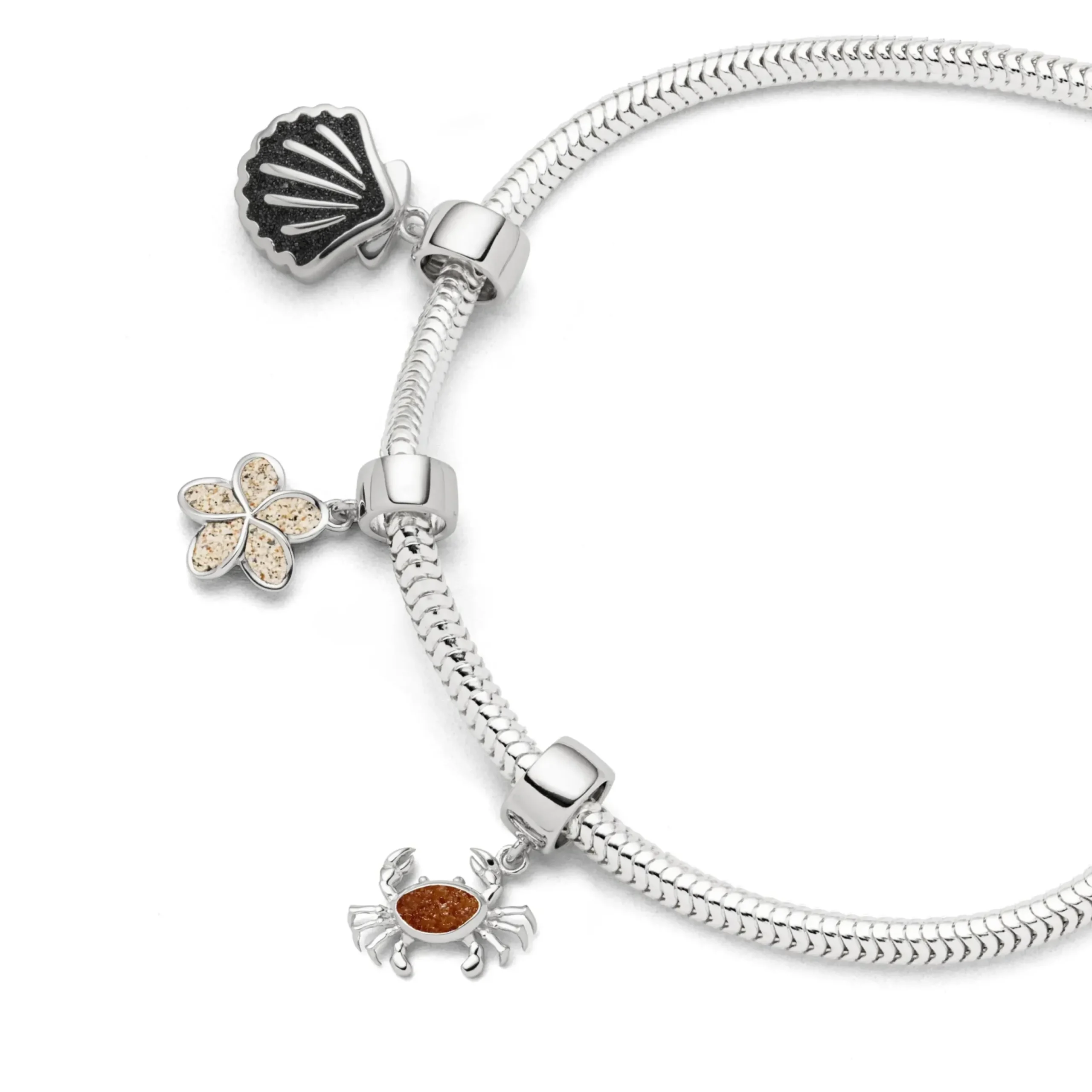 Echte Sehnsucht: Charm in Form einer Muschel, teilweise gefüllt mit Lavasand, alles aus poliertem und rhodiniertem 925er Sterling-Silber. Zu kombinieren mit A 1134 in verschiedenen Längen.