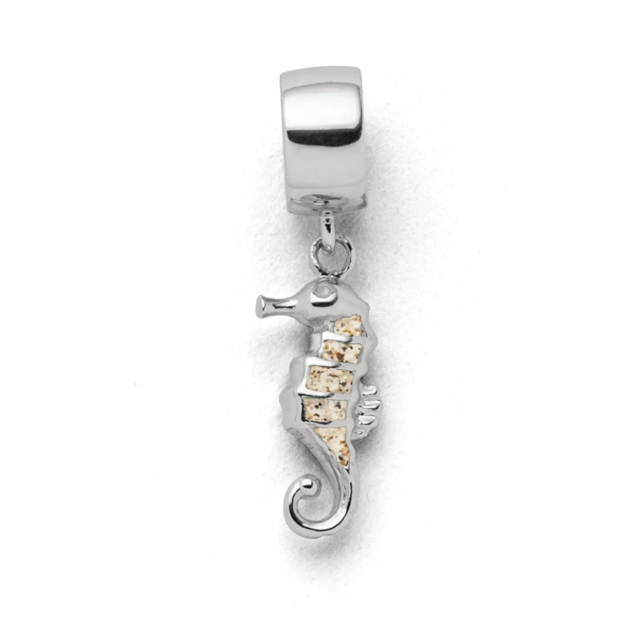 Echte Sehnsucht: Charm in Form eines Seepferdchens, teilweise gefüllt mit Strandsand, alles aus poliertem und rhodiniertem 925er Sterling-Silber. Zu kombinieren mit A 1134 in verschiedenen Längen.