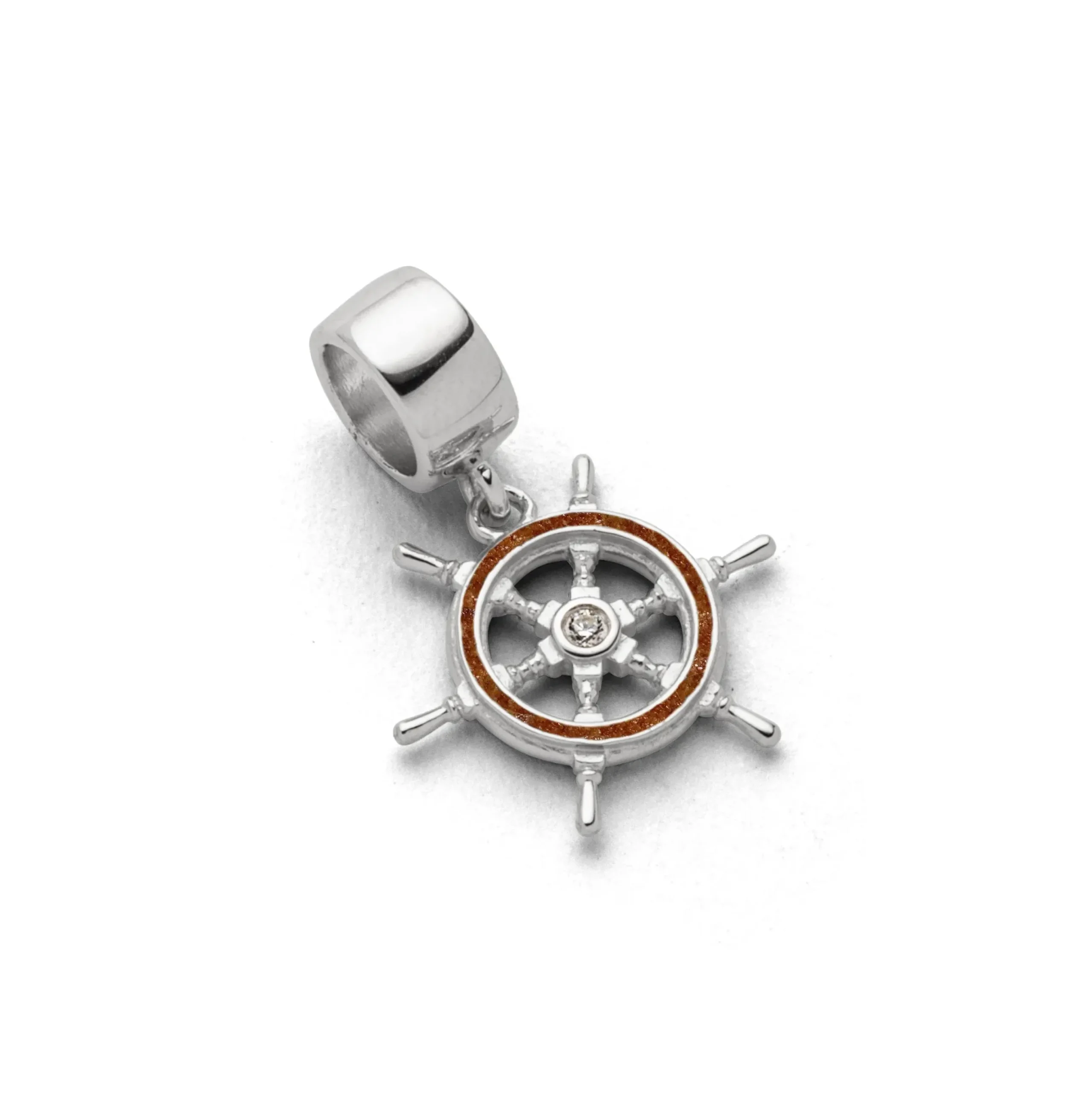 Echte Sehnsucht: Charm in Form eines Steuerrads, der äußere Ring gefüllt mit Bermsteinsand und einem mittig eingefassten Zirkoniastein, alles aus poliertem und rhodiniertem 925er Sterling-Silber. Zu kombinieren mit A 1134 in verschiedenen Längen.