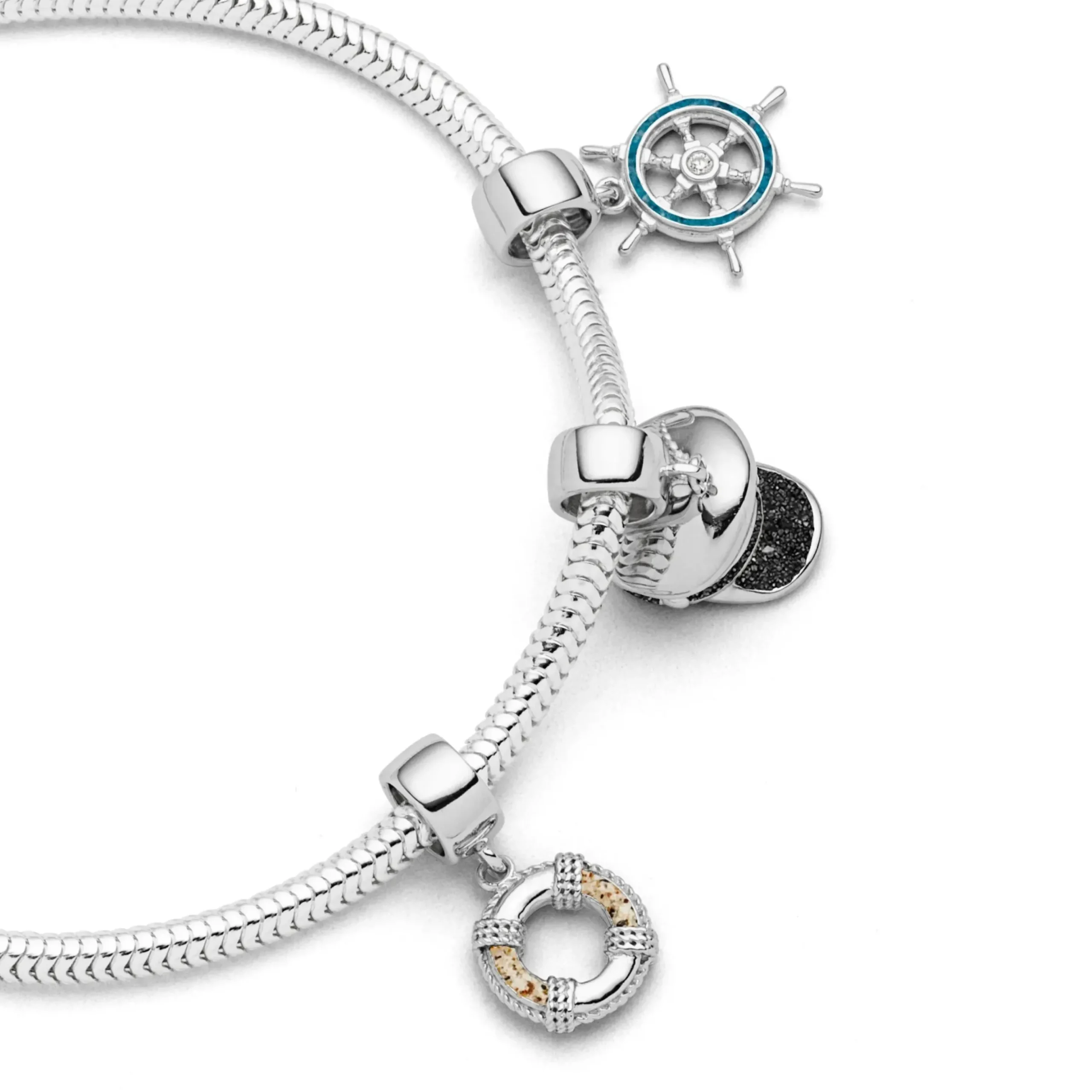 Echte Sehnsucht: Charm in Form eines Steuerrads, der äußere Ring gefüllt mit blauem Kyanit Steinsand und einem mittig eingefassten Zirkoniastein, alles aus poliertem und rhodiniertem 925er Sterling-Silber. Zu kombinieren mit A 1134 in verschiedenen Längen.