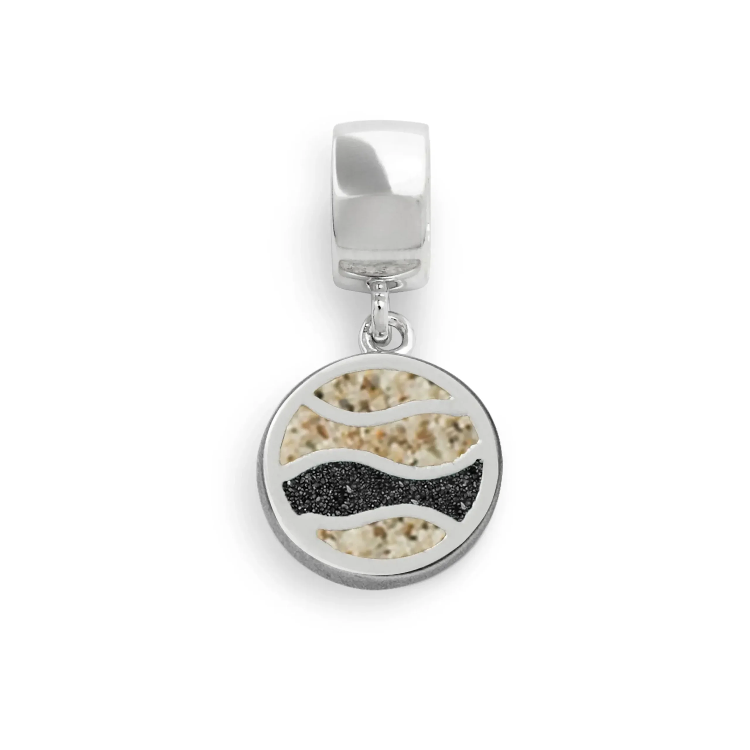 Charm „Strandwellen“ mit Wellenmuster, gefüllt mit Strandsand und schwarzem Lavasand, gefaßt in rhodiniertem 925er Sterlingsilber.