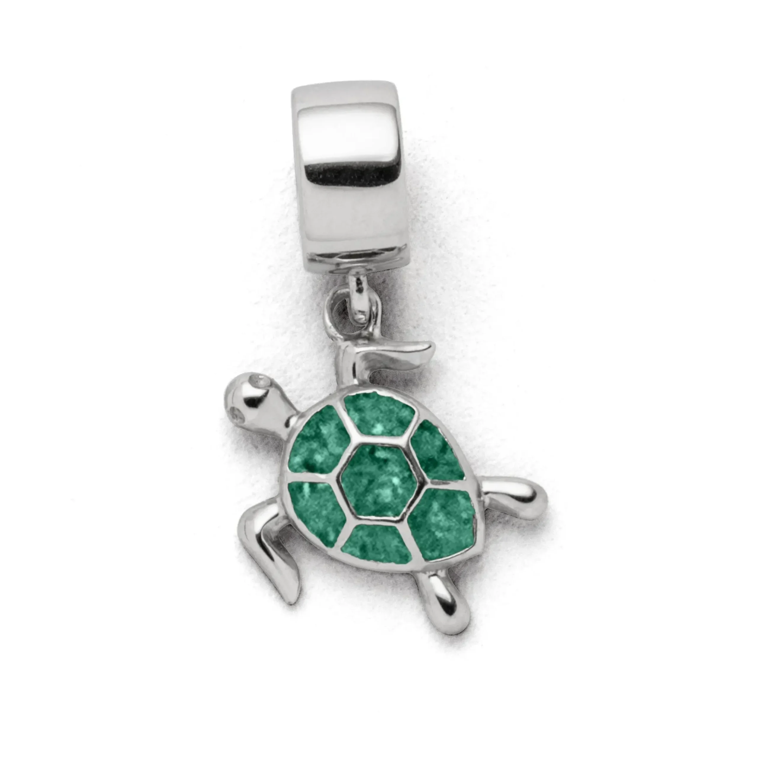 Echte Sehnsucht: Charm in Form einer Schildkröte, teilweise gefüllt mit grünem Steinsand, alles aus poliertem und rhodiniertem 925er Sterling-Silber. Zu kombinieren mit A 1134 in verschiedenen Längen.