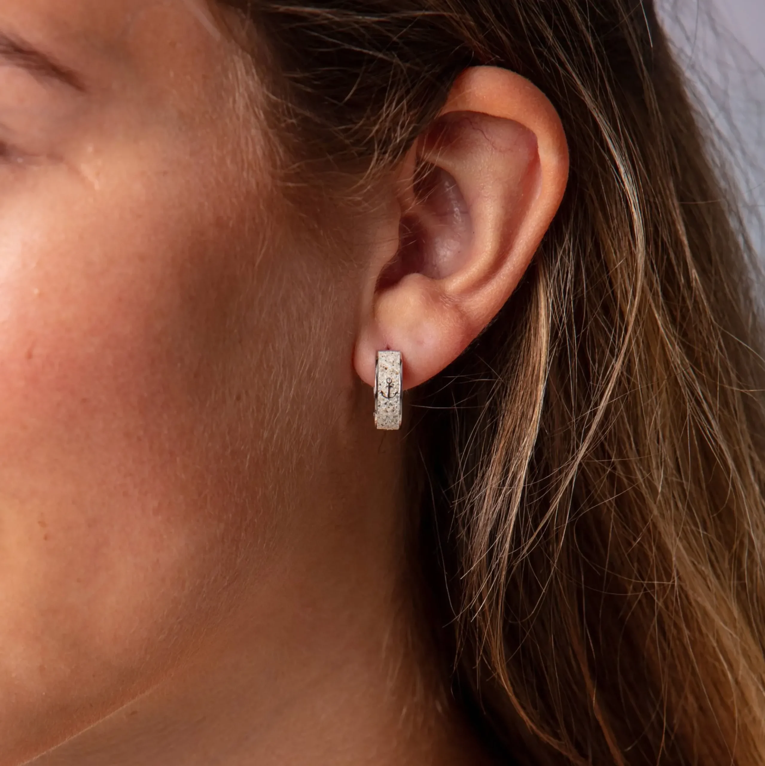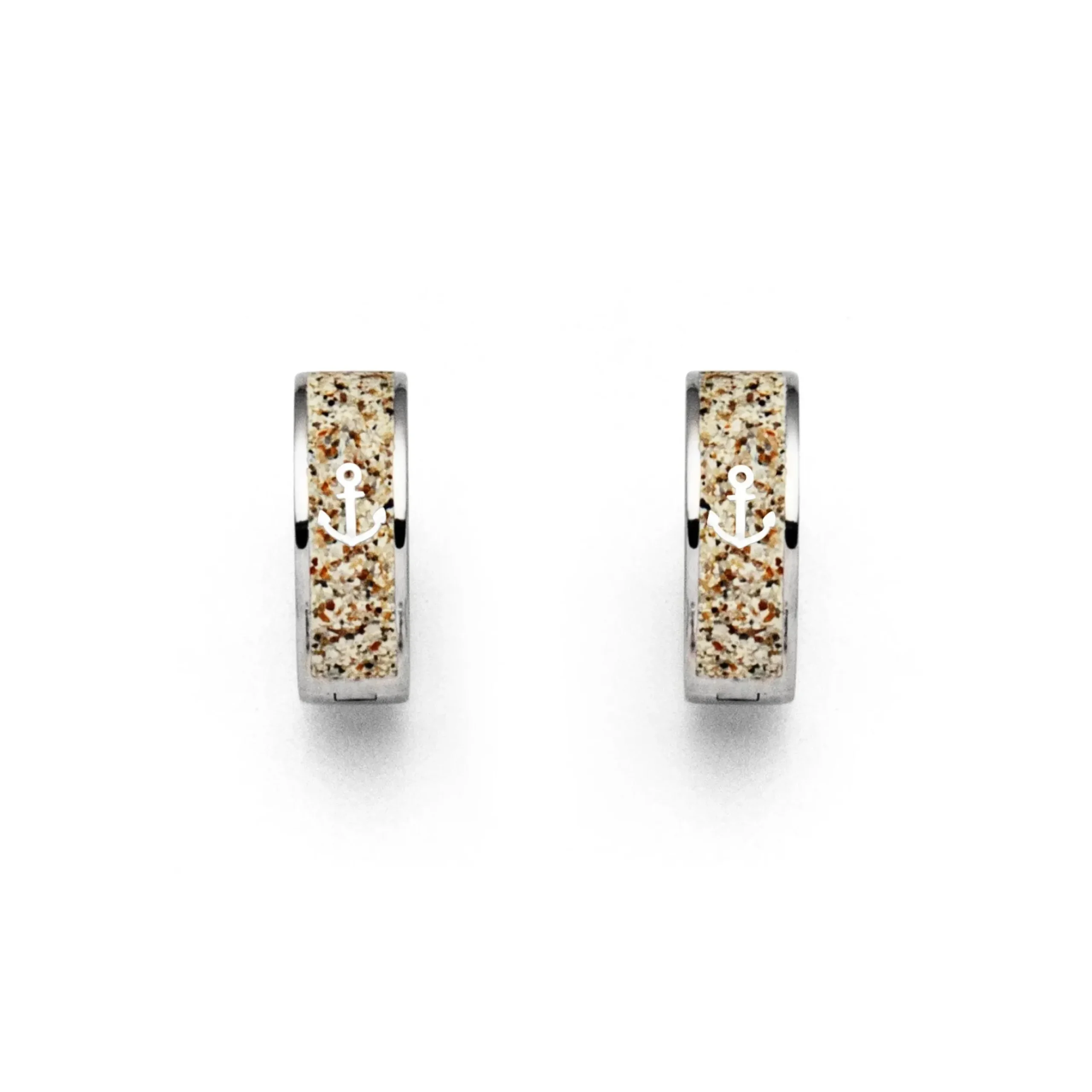 Klappcreole „Anker“ mit einem kleinen in Strandsand gebetteten Anker, gefaßt in rhodiniertem 925er Sterlingsilber.