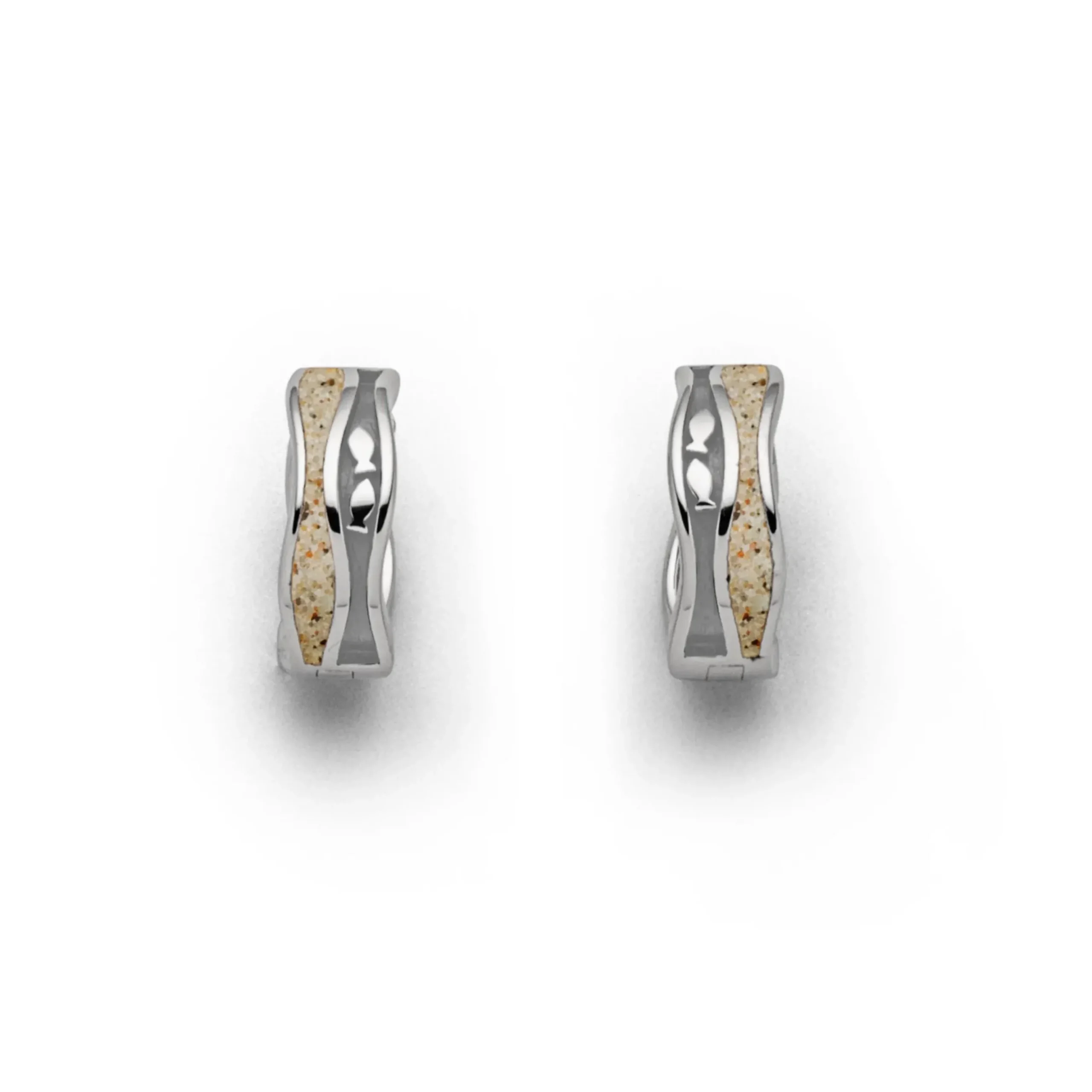 Creole „Fischschwarm“, die eine Hälfte ist sandlos, die andere Hälfte mit Strandsand gefüllt, alles aus rhodiniertem 925er Sterling-Silber. Durch die Rhodinierung ist das Schmuckstück anlaufgeschützt.