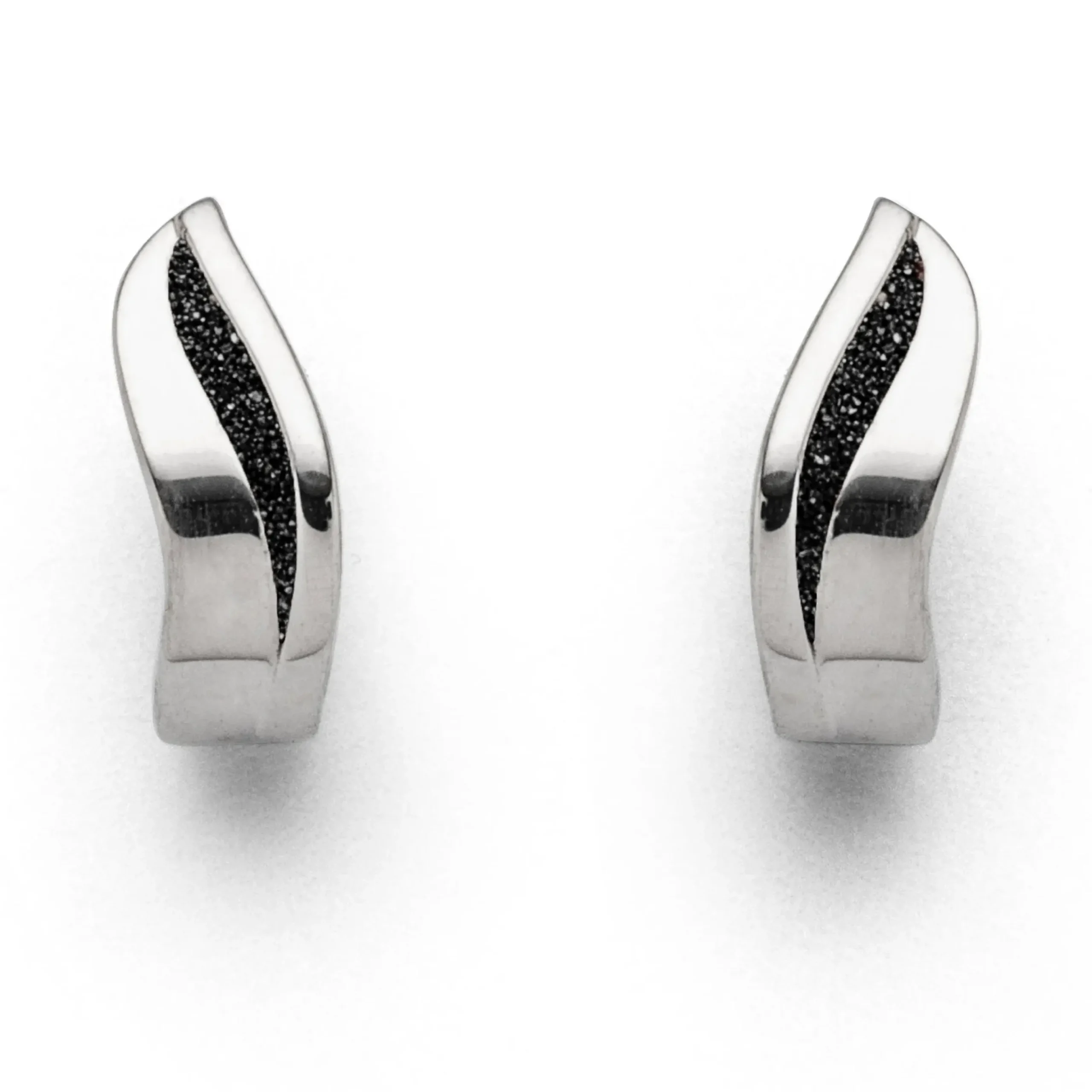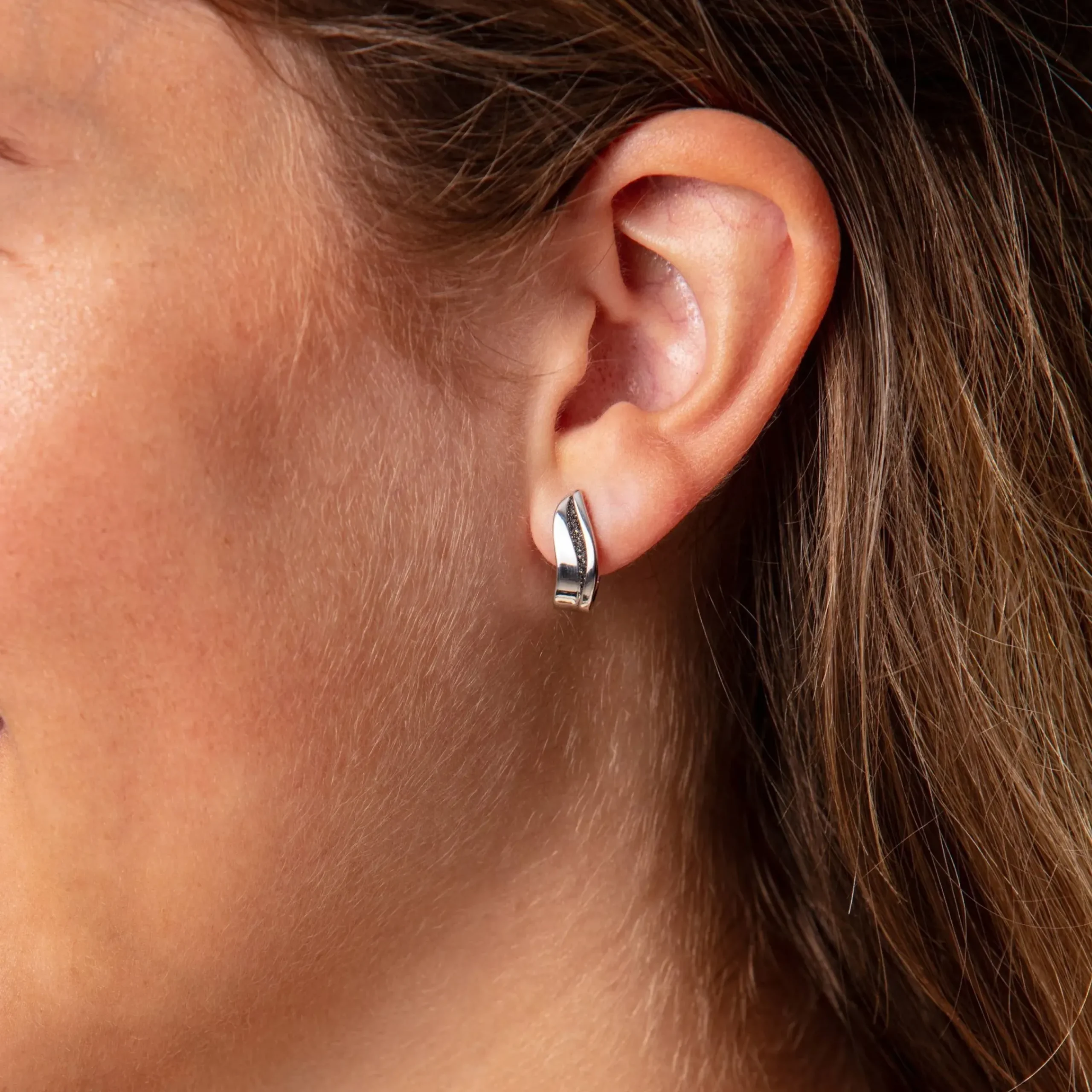 Geschwungene Klappcreole mit einem kleinen Silberschweif mit Lavasand gefüllt, gefaßt in rhodiniertem 925er Sterlingsilber.