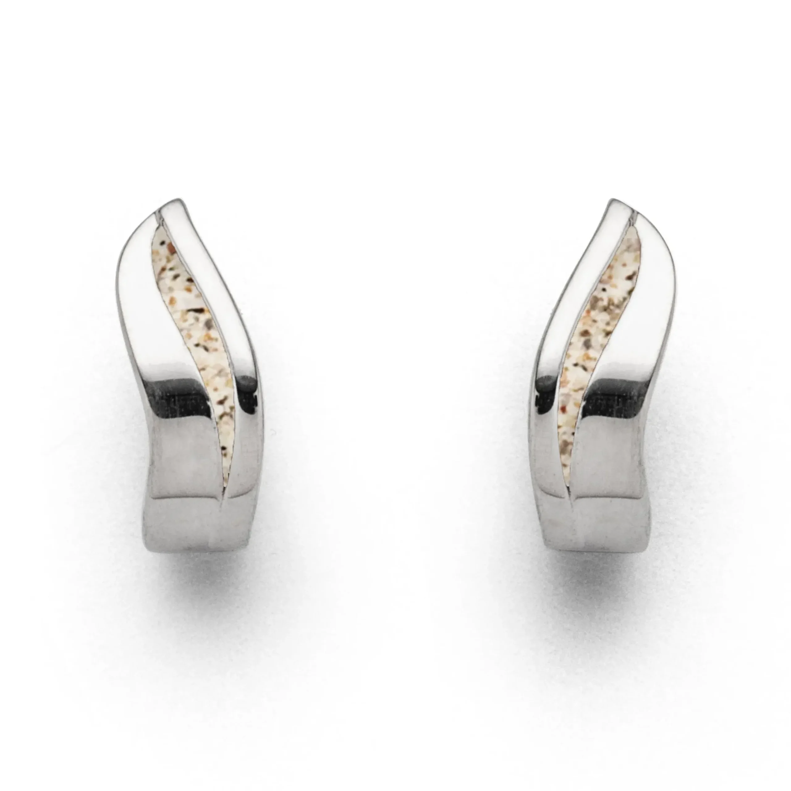 Geschwungene Klappcreole mit einem kleinen Silberschweif mit Strandsand gefüllt, gefaßt in rhodiniertem 925er Sterlingsilber.