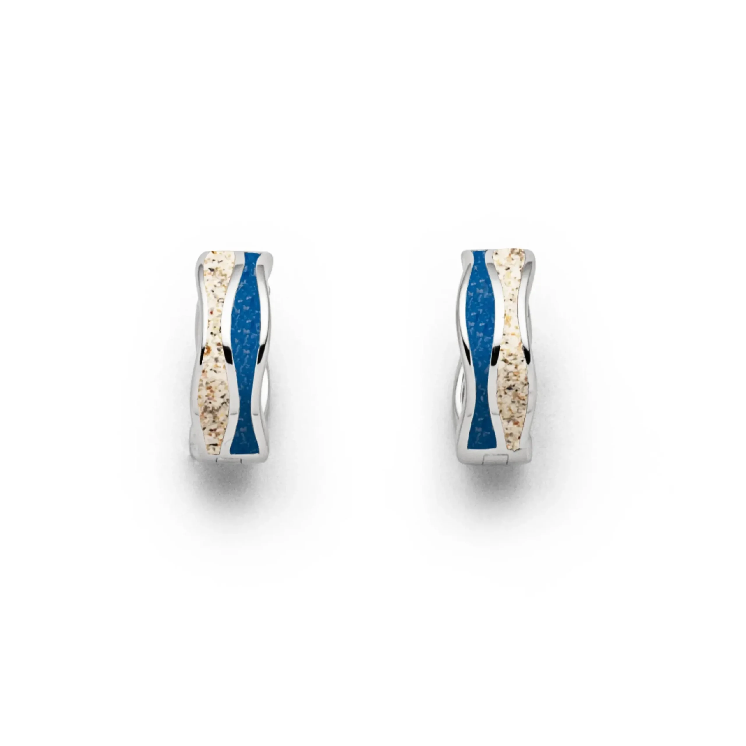 Creole „Strandwellen“, eine Hälfte mit Strandsand und die andere mit blauem Steinsand gefüllt, getrennt durch eine Welle, alles aus rhodiniertem 925er Sterling-Silber. Durch die Rhodinierung ist das Schmuckstück anlaufgeschützt.
