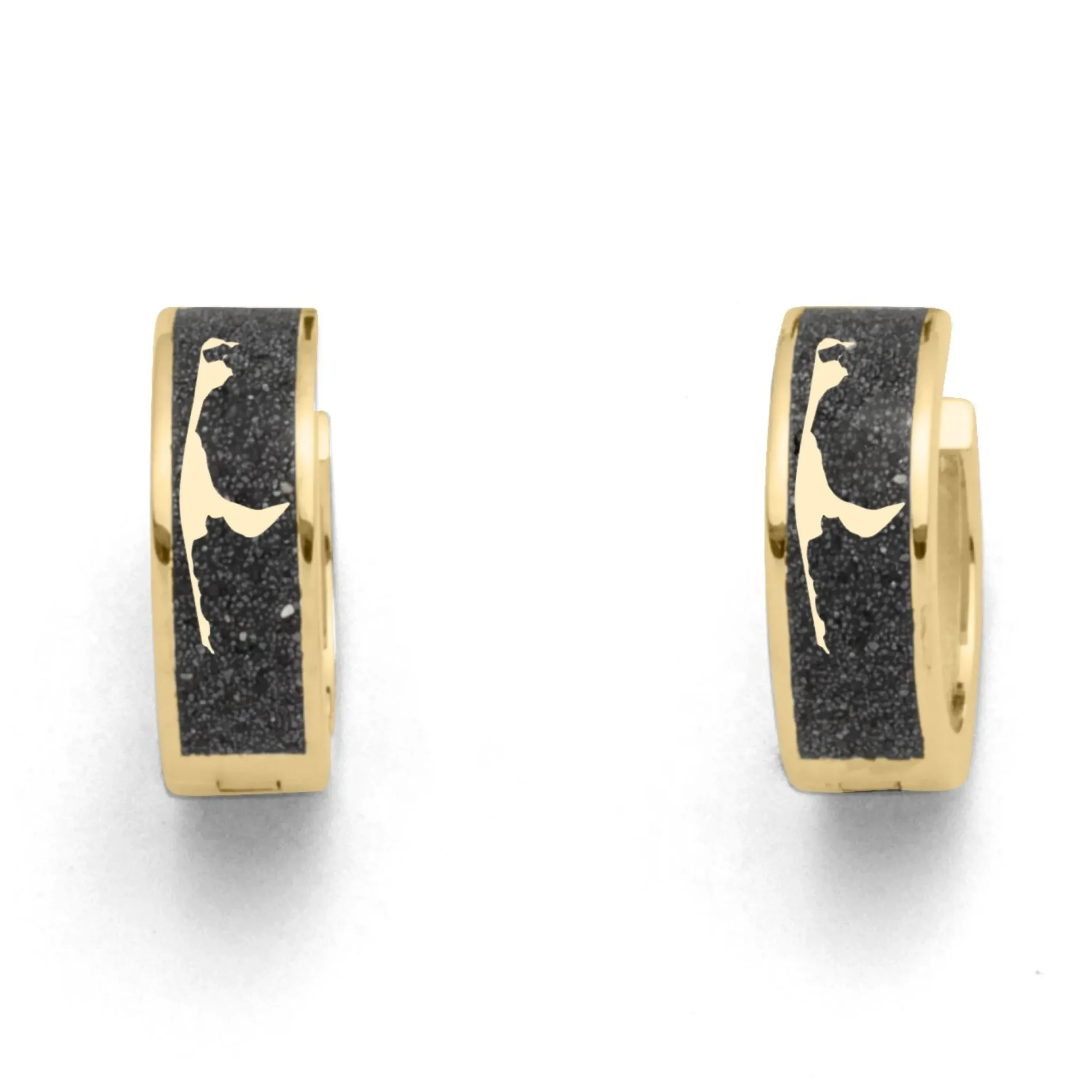 Klappcreole „Sylt“ mit der in Lavasand gebetteten Inselsilhouette von Sylt, gefaßt in vergoldetem 925er Sterlingsilber.