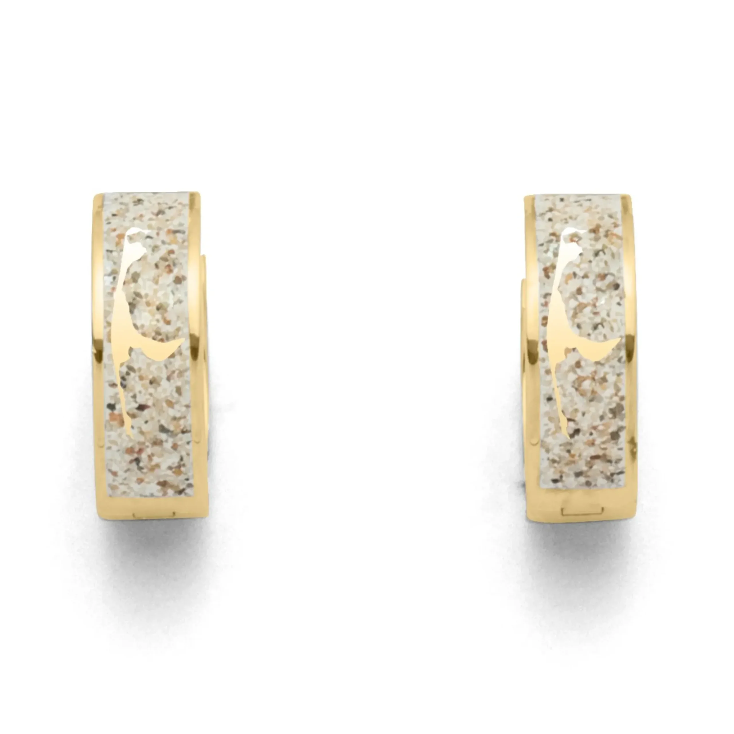 Klappcreole „Sylt“ mit der in Strandsand gebetteten Inselsilhouette von Sylt, gefaßt in vergoldetem 925er Sterlingsilber.