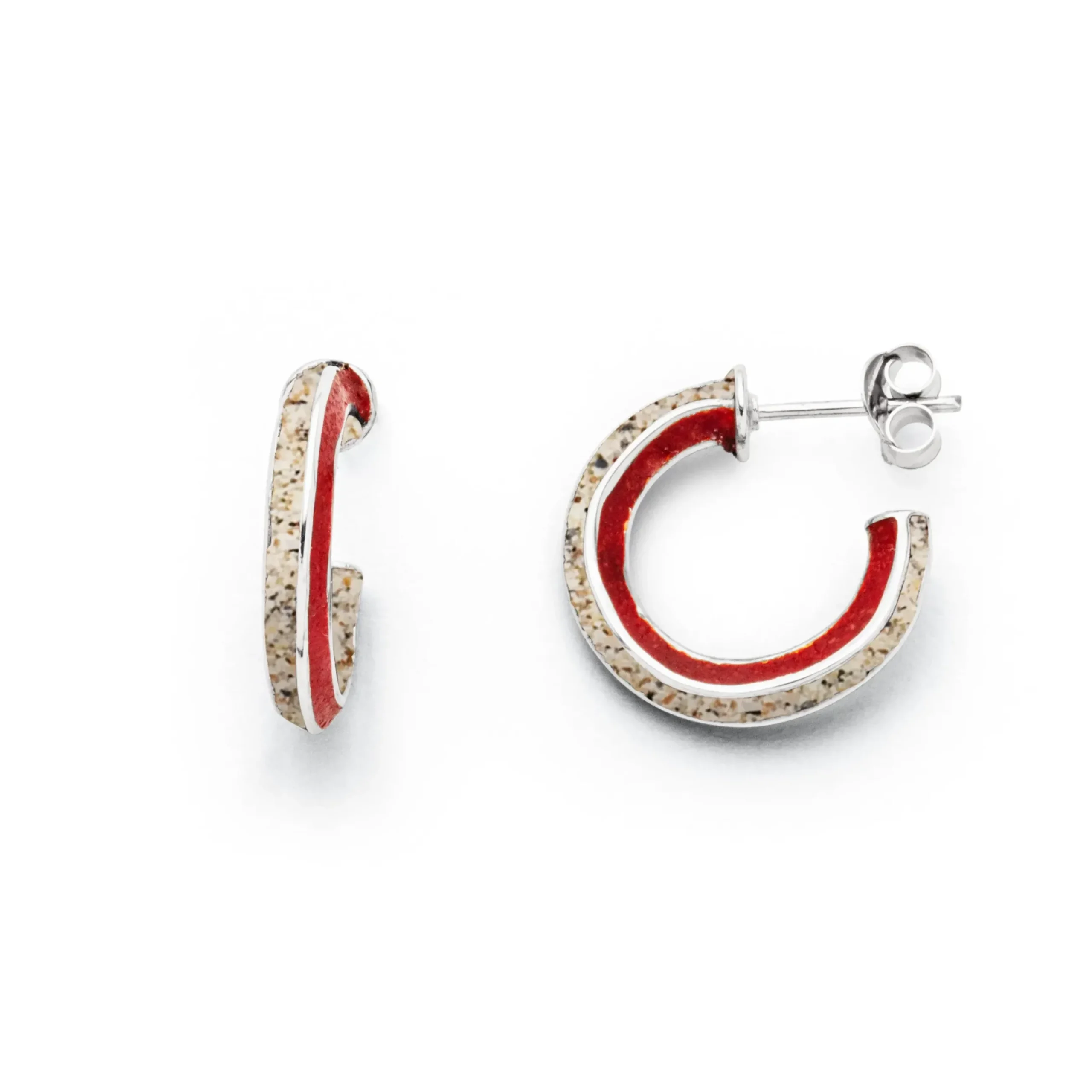 Creole „Wellenspiel“, handgefertigt, mit leicht geschwungenen Elementen, wechselweise gefüllt mit Strandsand und Korallengranulat, alles aus rhodiniertem 925er Sterlingsilber