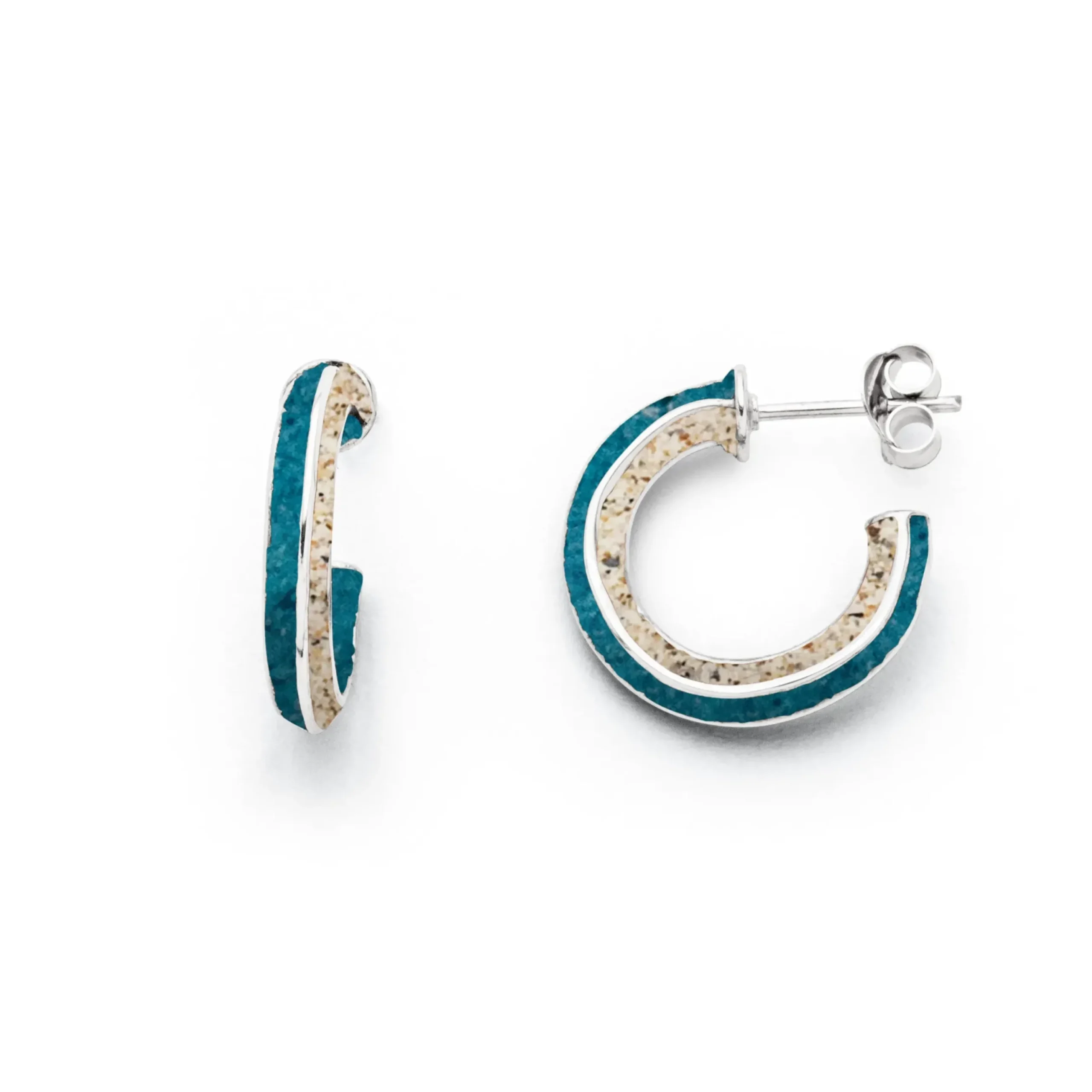 Creole „Wellenspiel“, handgefertigt, mit leicht geschwungenen Elementen, wechselweise gefüllt mit Strandsand und blauem Steinsand, alles aus rhodiniertem 925er Sterlingsilber