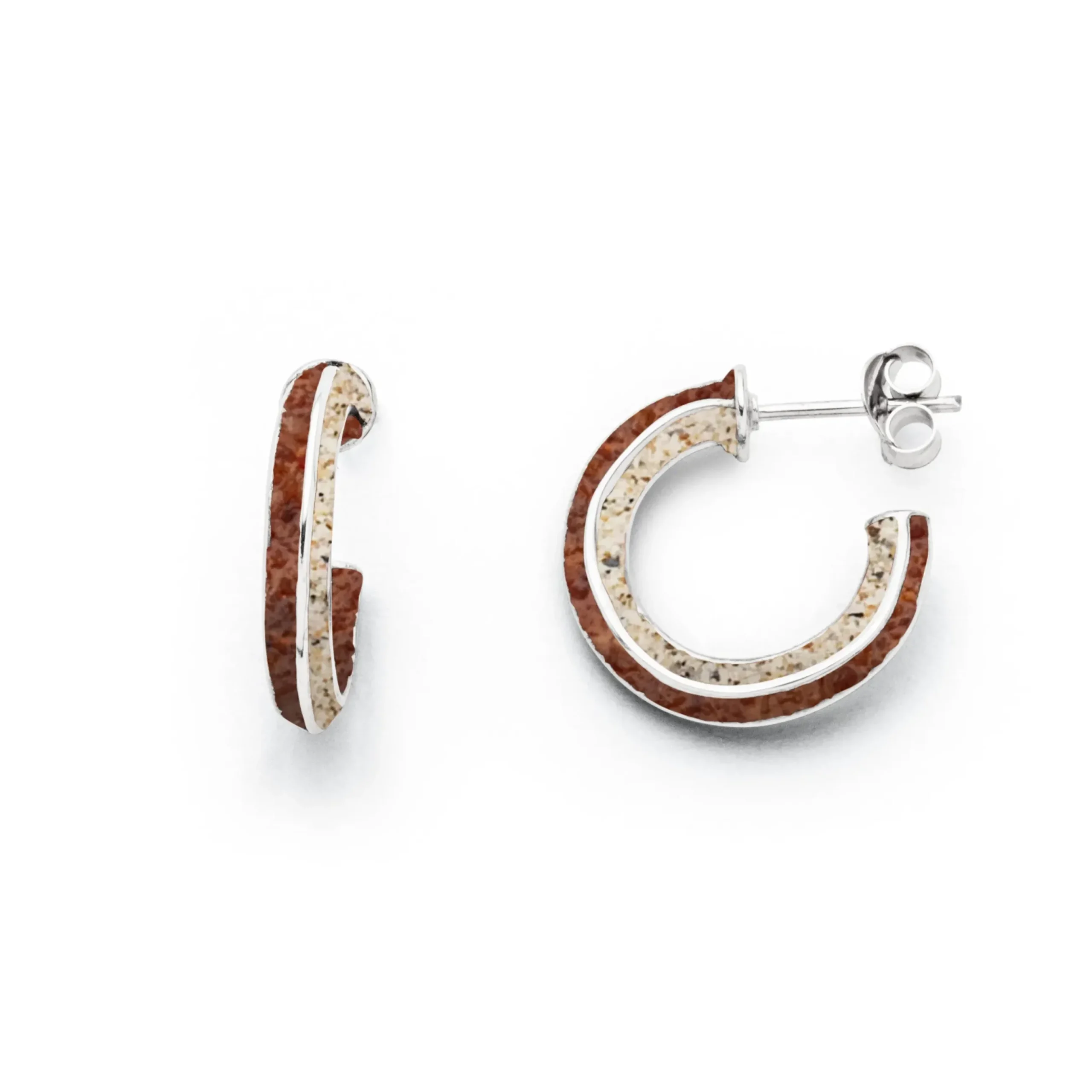 Creole „Wellenspiel“, handgefertigt, mit leicht geschwungenen Elementen, wechselweise gefüllt mit Strandsand und Bernsteinsand, alles aus rhodiniertem 925er Sterlingsilber