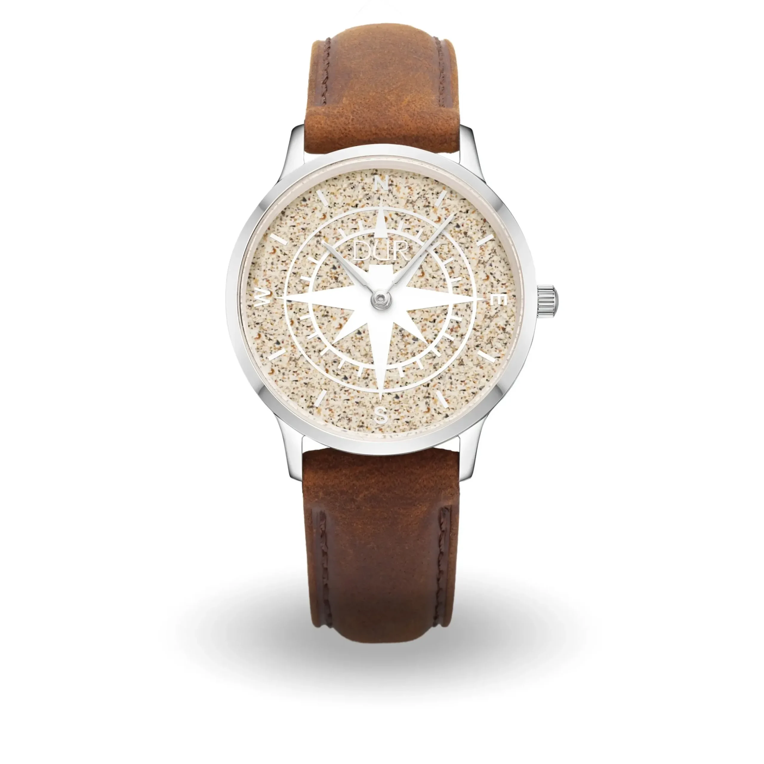 DUR Watch „Kompass“, wasserdichte Edelstahl DUR Watch mit Saphirglas und polierten Zeigern in Schwertform. Auf dem Ziffernblatt eine horizontal mattierte Kompassrose, die mit Strandsand gefüllt ist. An einem 20 mm breiten, braun gesteppten Rindslederband