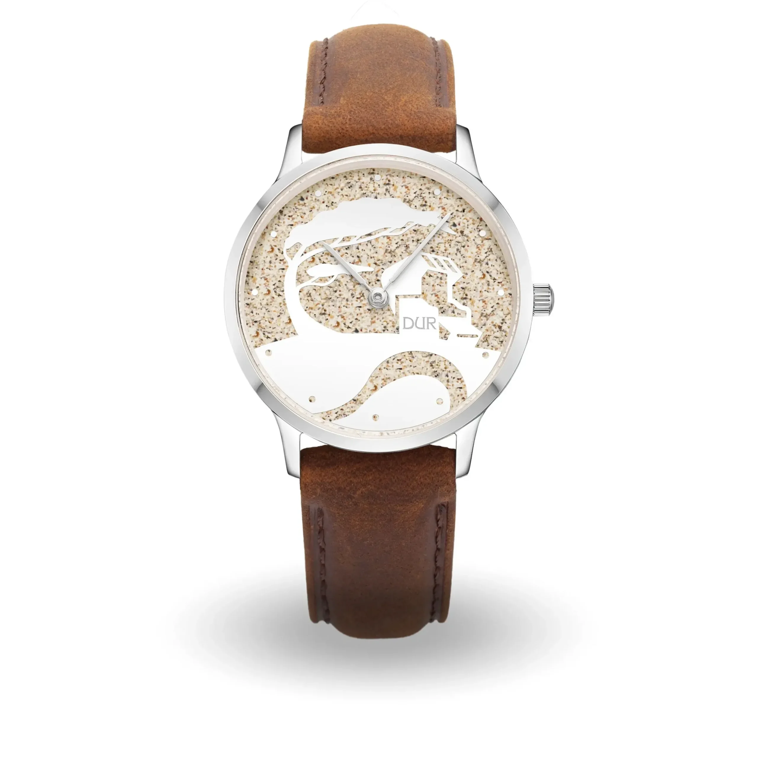 DUR Watch „Küste“, wasserdichte Edelstahl DUR Watch mit Saphirglas und mattierten Zeigern. Auf dem Ziffernblatt ein polierter Windflüchter und ein Strandkorb mit Strandsand gefüllt. An einem 20 mm breiten, braun gesteppten Rindslederband