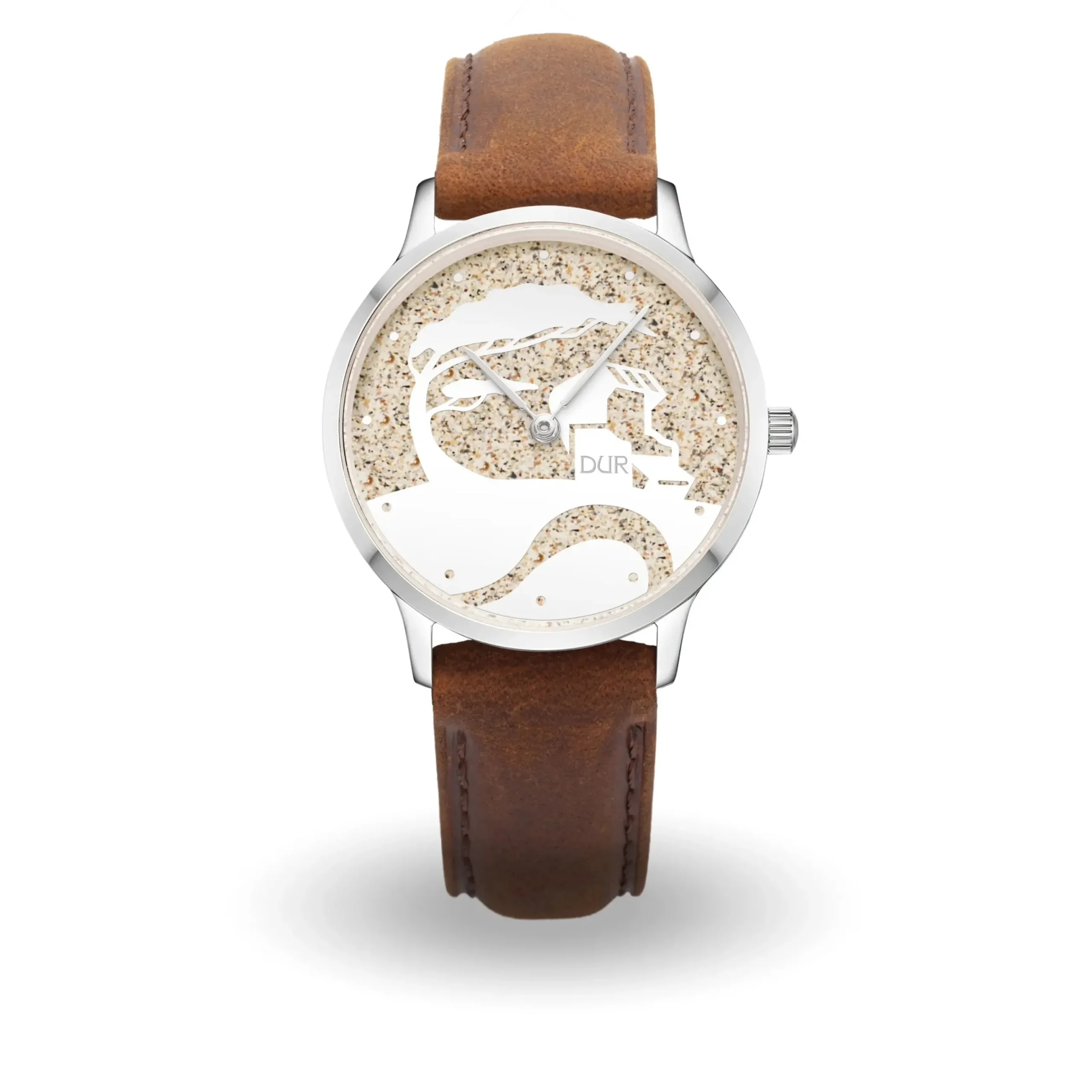 DUR Watch „Küste“, wasserdichte Edelstahl DUR Watch mit Saphirglas und polierten Zeigern in Schwertform. Auf dem Ziffernblatt ein horizontal mattierter Windflüchter und ein Strandkorb mit Strandsand gefüllt. An einem 20 mm breiten, braun gesteppten Rindslederband