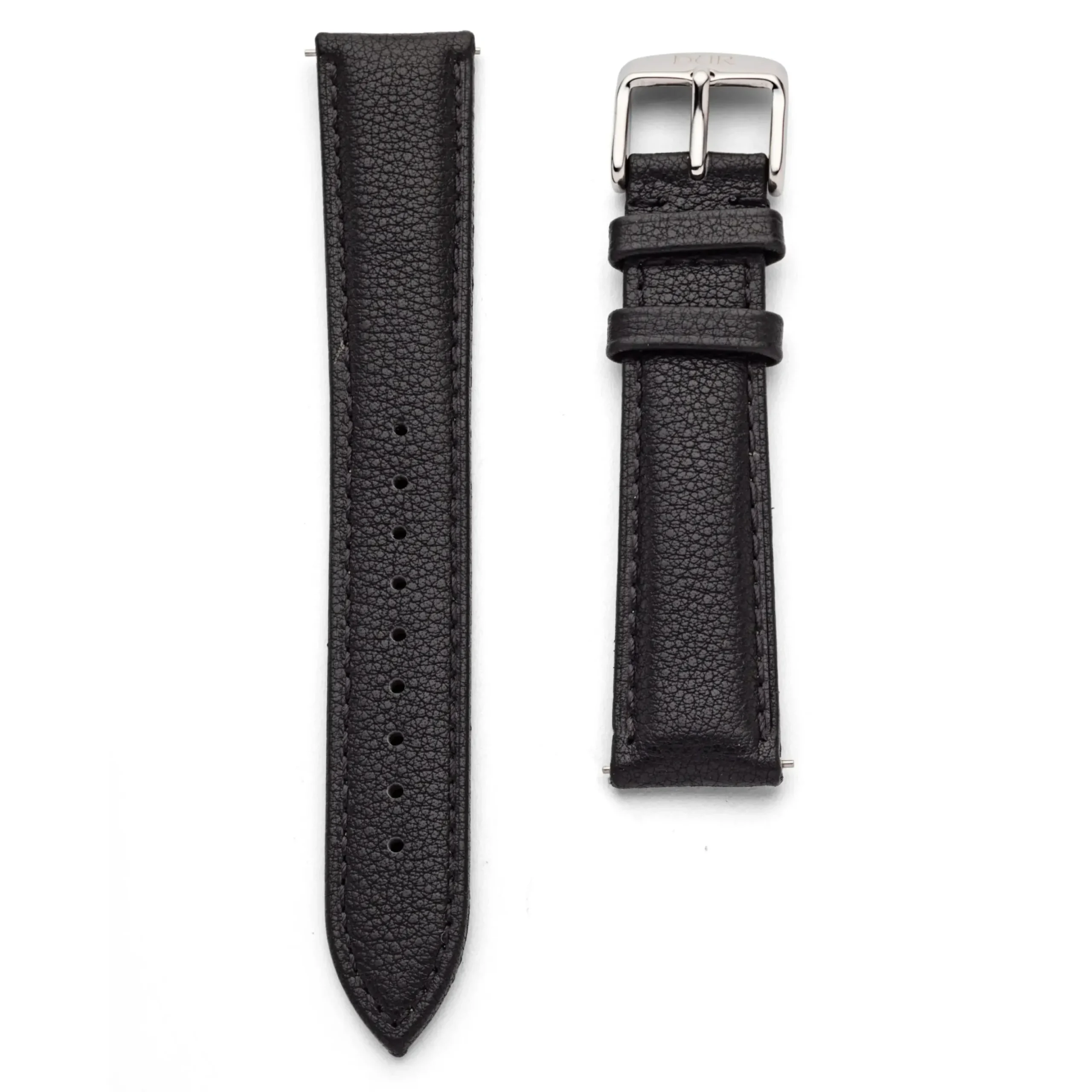 DUR Watch Armband, schwarz gestepptes Rindslederband, 18 mm Anstoßbreite leicht verlaufend mit einer Edelstahlschließe.