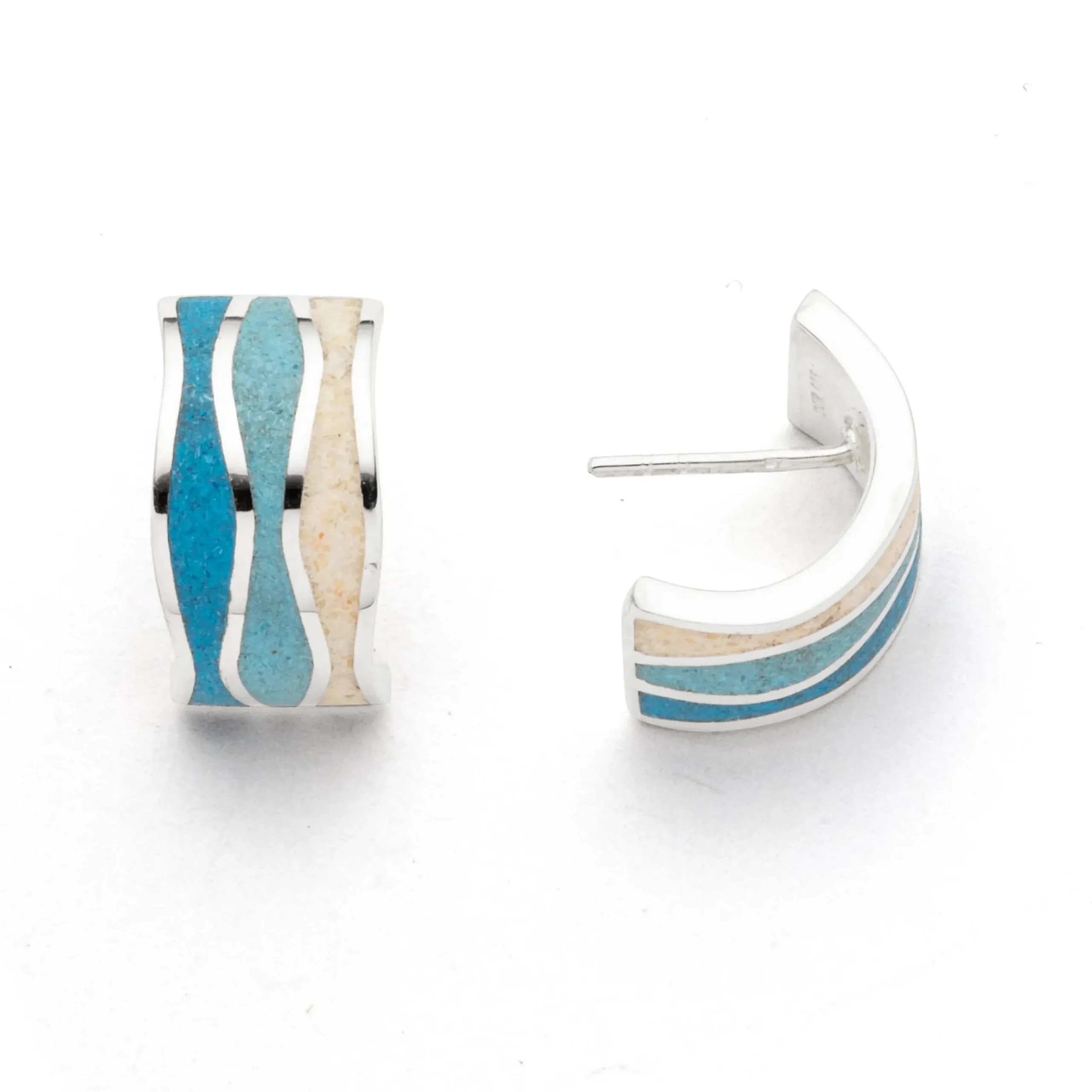 Halbcreole „Welle“, handgefertigt und gefüllt mit Strandsand und blauem Steinsand in zwei verschiedenen Blautönen, jeweils getrennt durch eine silberne Welle, alles aus rhodiniertem 925er Sterling-Silber. Durch die Rhodinierung ist das Schmuckstück anlaufgeschützt.