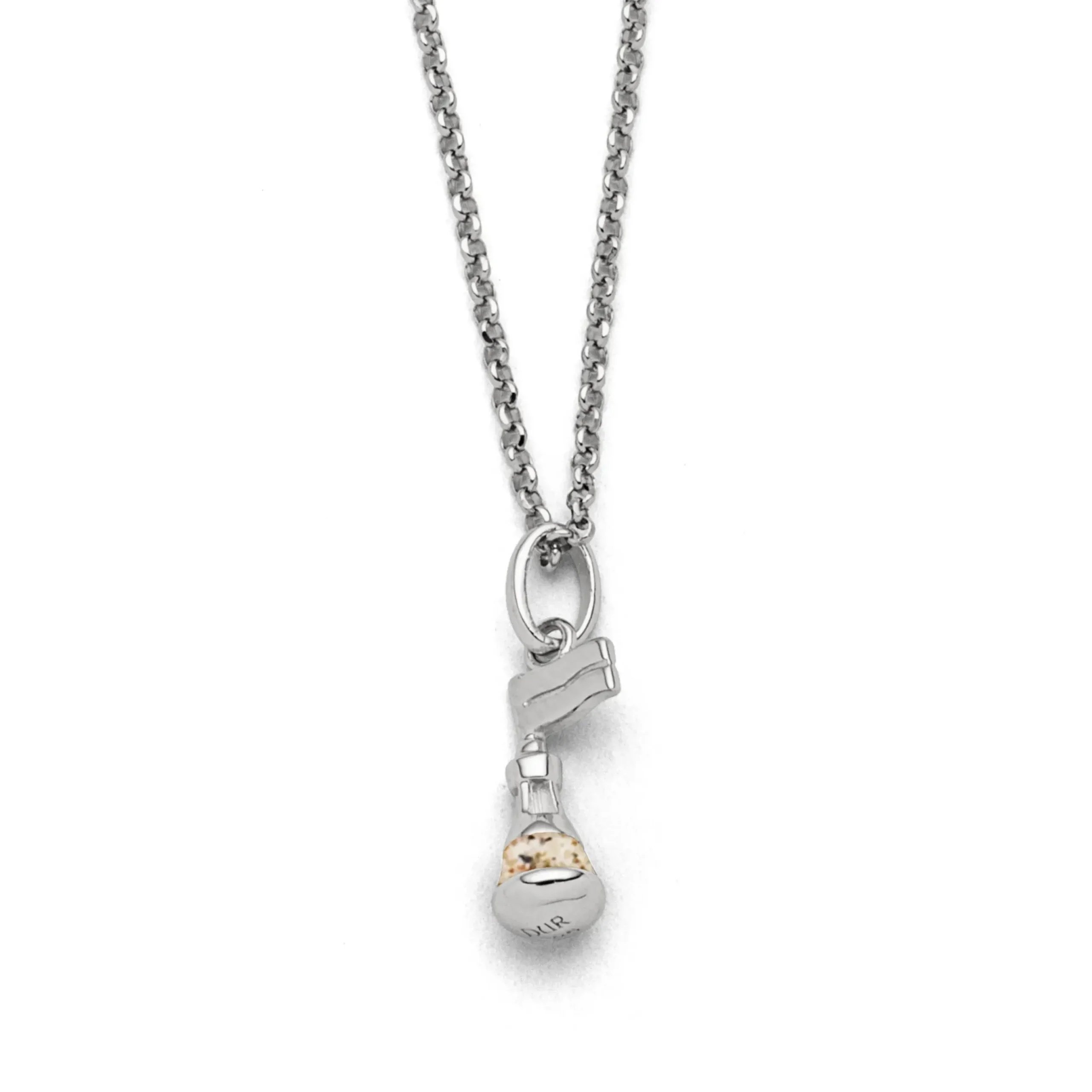 Echte Sehnsucht: Feine Erbskette rhodiniert mit einem Anhänger in Form einer Boje, im unteren Teil gefüllt mit Strandsand, alles aus poliertem und rhodiniertem 925er Sterling-Silber, ca. 42 cm lang. Durch die Rhodinierung ist das Schmuckstück anlaufgeschützt.