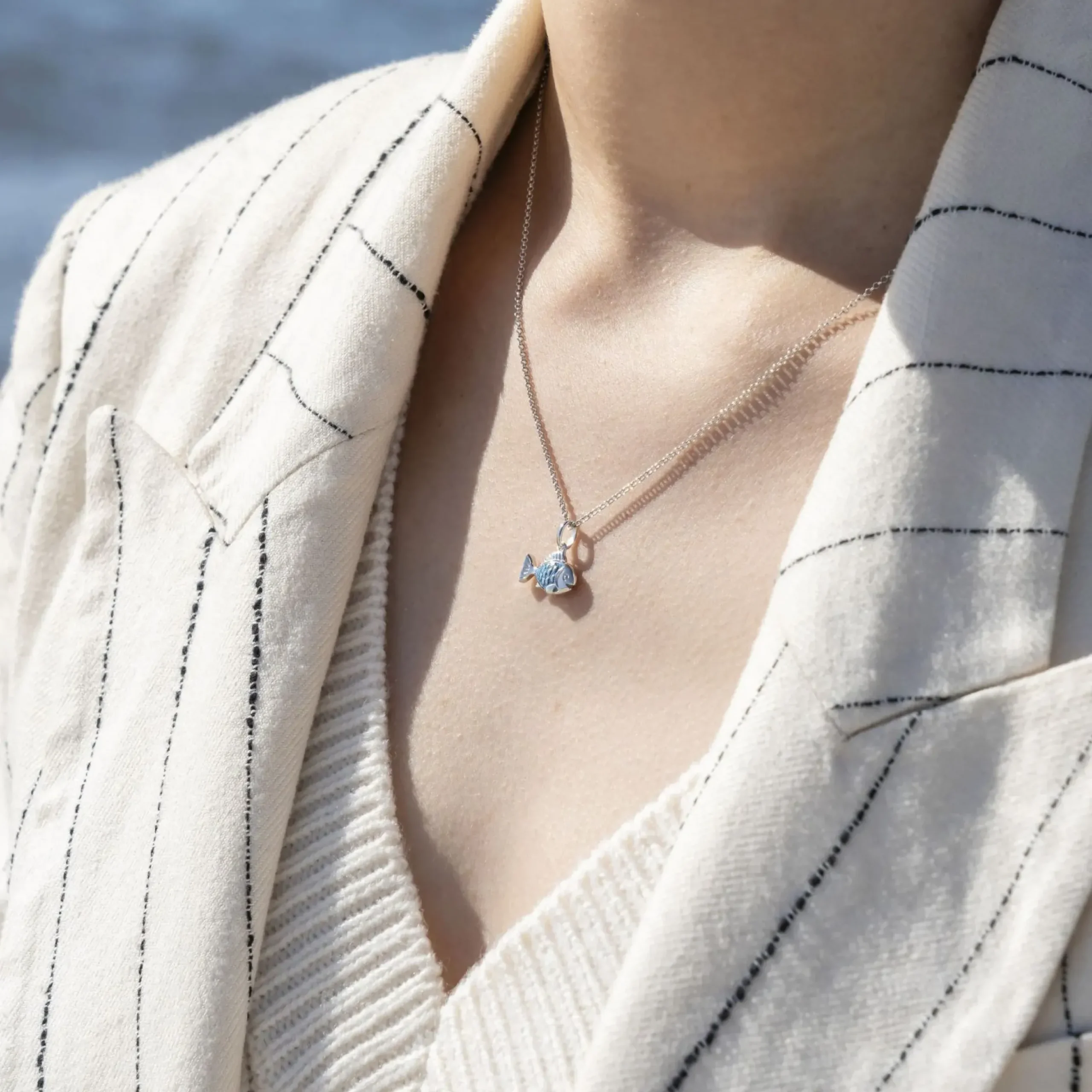 Echte Sehnsucht: Feine Erbskette rhodiniert mit einem Anhänger in Form eines Fisches, gefüllt mit blauem Kyanitsteinsand, alles aus poliertem und rhodiniertem 925er Sterling-Silber, ca. 45 cm lang. Durch die Rhodinierung ist das Schmuckstück anlaufgeschützt.