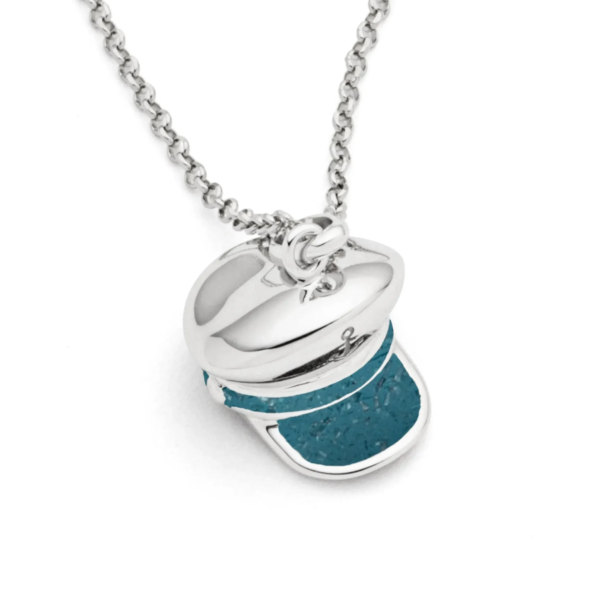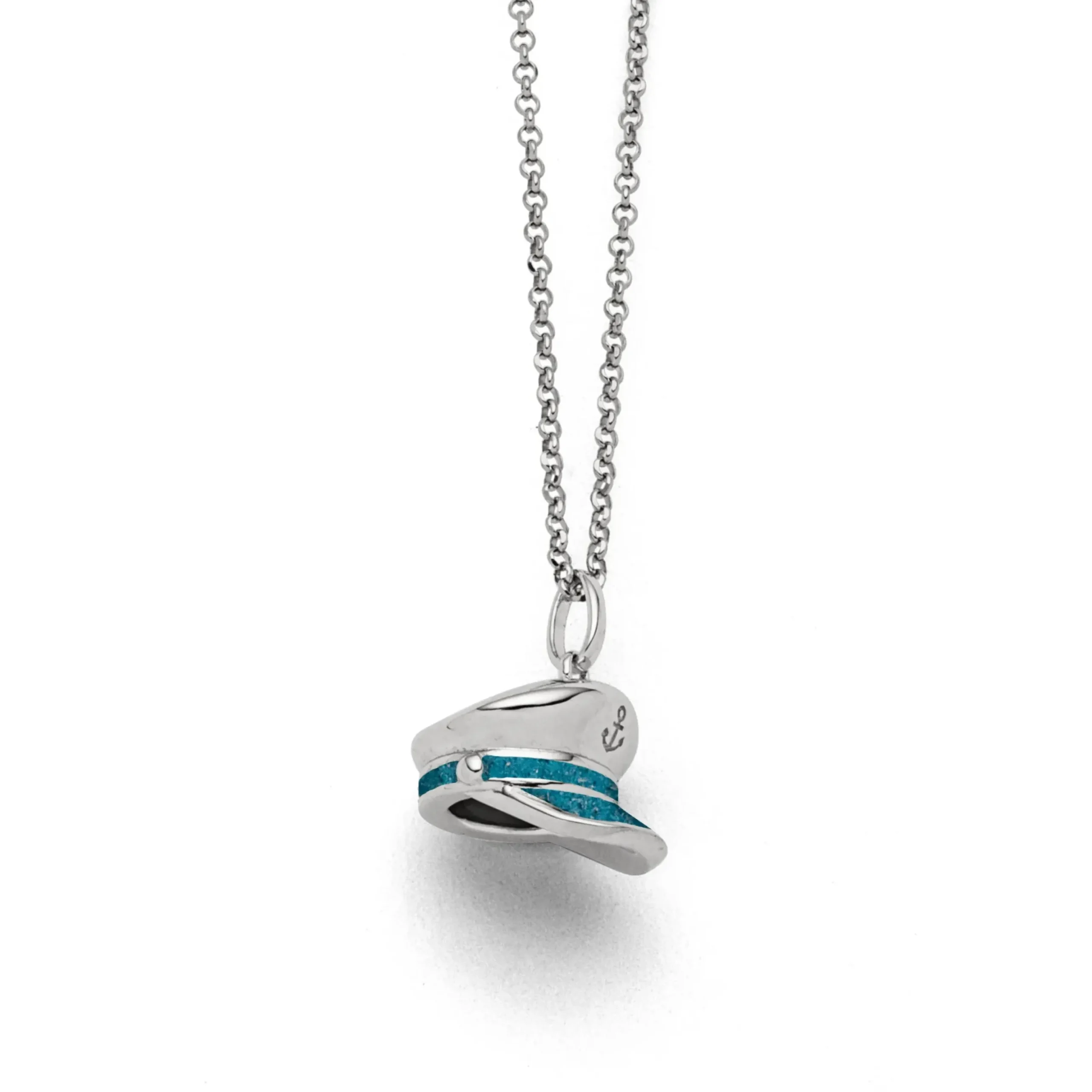 Echte Sehnsucht: Feine Erbskette rhodiniert mit einem Anhänger in Form einer Kapitänsmütze, der Schirm der Mütze ist mit blauem Steinsand gefüllt, alles aus poliertem und rhodiniertem 925er Sterling-Silber, ca. 42 cm lang. Durch die Rhodinierung ist das Schmuckstück anlaufgeschützt.