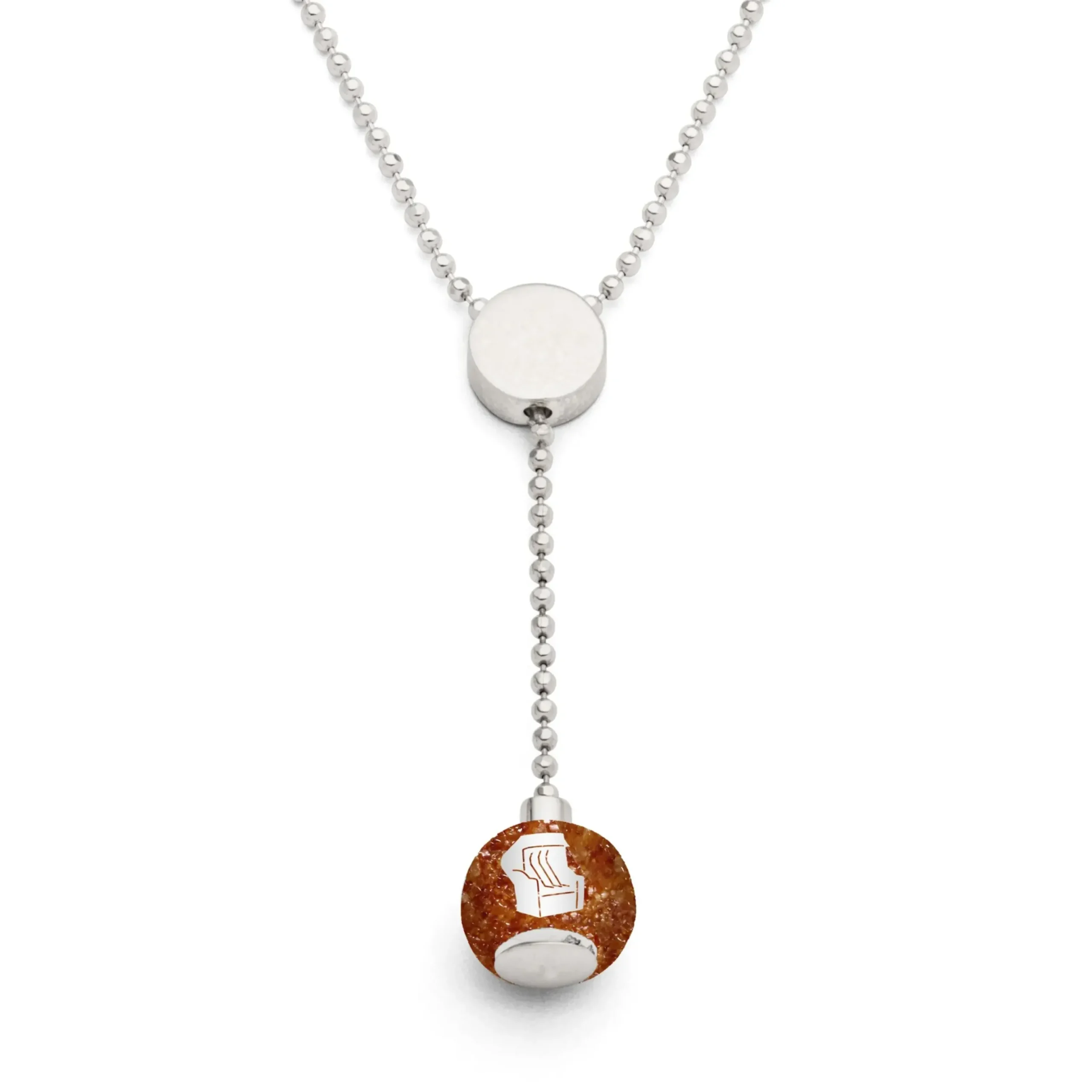 Kette „Ostsee“ mit Bernsteinsand, kombiniert aus einer ca. 42 cm langen, rhodinierten Adapterkette und einem mit Bernsteinsand gefüllten „Ostsee-“ Bead, gefasst in rhodiniertem, 925er Sterling-Silber. Der Bead ist austauschbar.