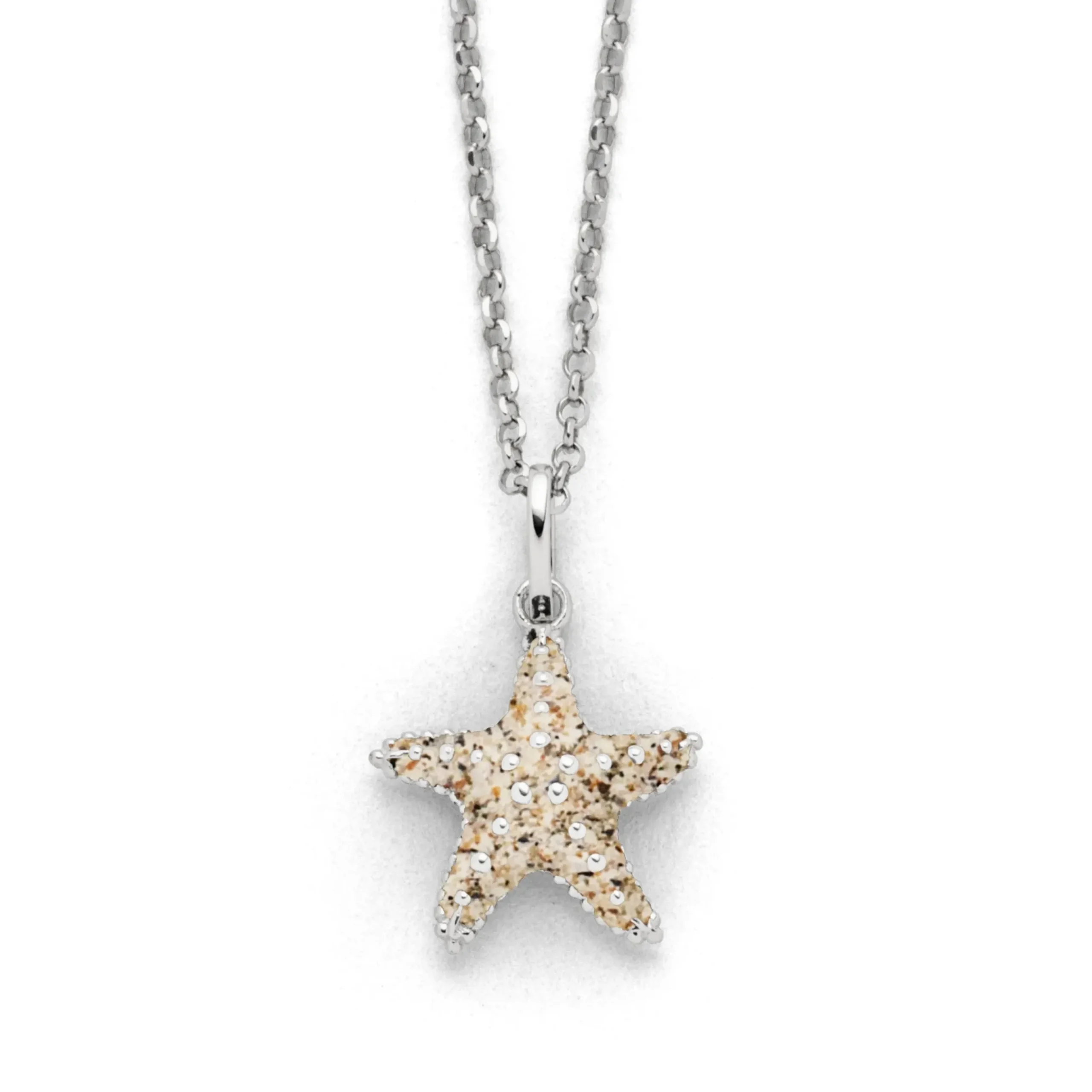 Echte Sehnsucht: Feine Erbskette rhodiniert mit einem Anhänger in Form eines Seesterns, gefüllt mit Strandsand, alles aus poliertem und rhodiniertem 925er Sterling-Silber, ca. 45 cm lang. Durch die Rhodinierung ist das Schmuckstück anlaufgeschützt.