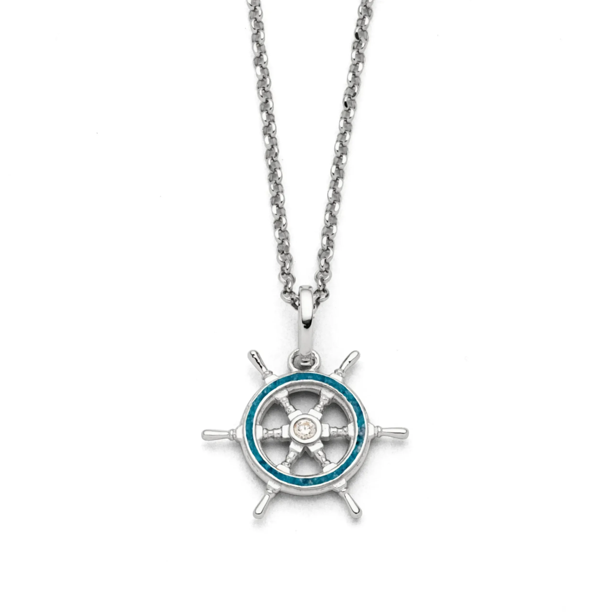 Echte Sehnsucht: Feine Erbskette rhodiniert mit einem Anhänger in Form eines Steuerrads, der äußere Ring gefüllt mit blauem Kyanitsteinsand und einem mittig eingefassten Zirkoniastein, alles aus poliertem und rhodiniertem 925er Sterling-Silber, ca. 42 cm lang. Durch die Rhodinierung ist das Schmuckstück anlaufgeschützt.