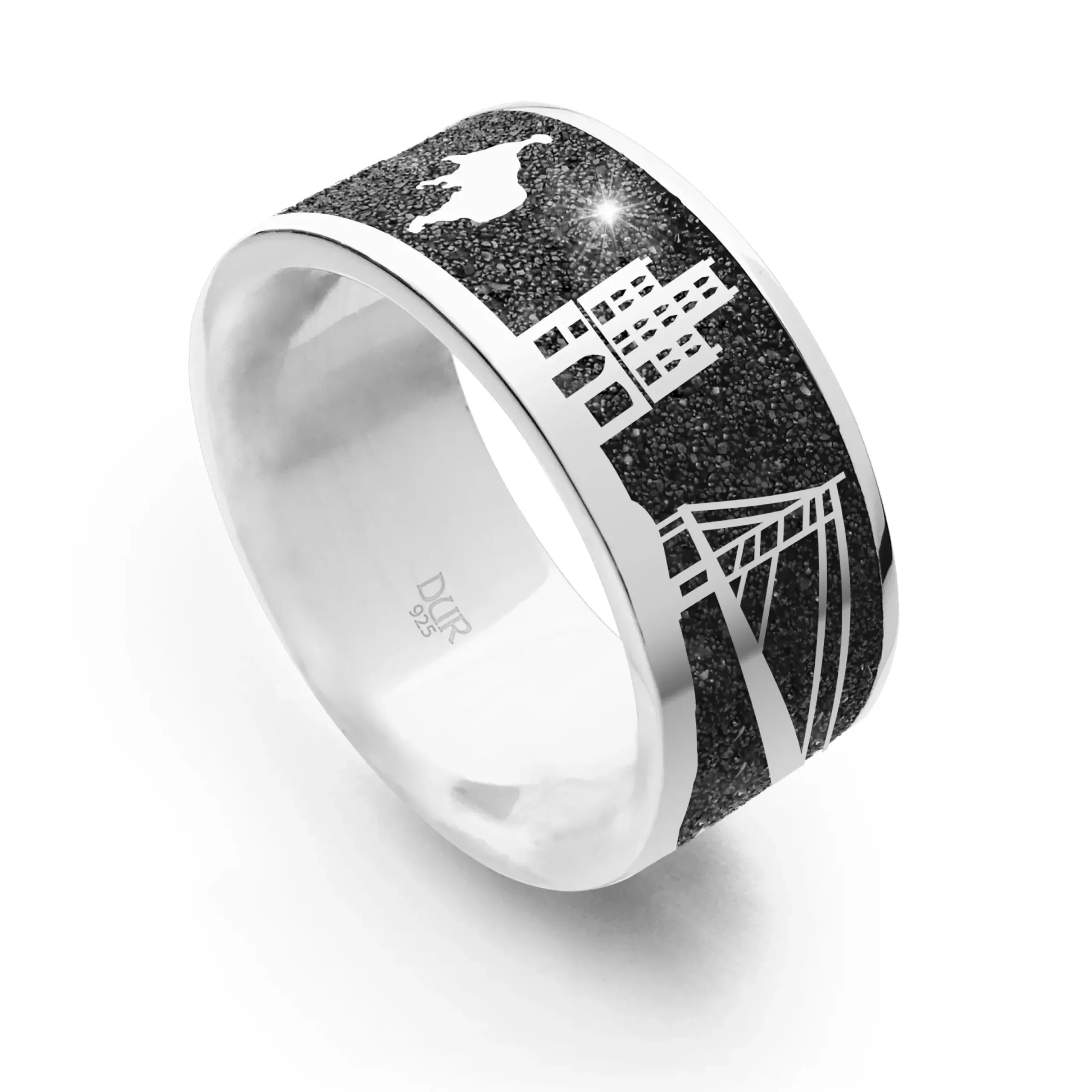 Nachtring „Meck-Pom“ mit den silbernen Motiven: Kreufahrtschiff, Schloss Schwerin, Müritz, „Alter Schwede“, Rügenbrücke + Segelschiff + Wellen, eingebettet in Lavasand und gefasst in rhodiniertem 925er Sterling-Silber.
