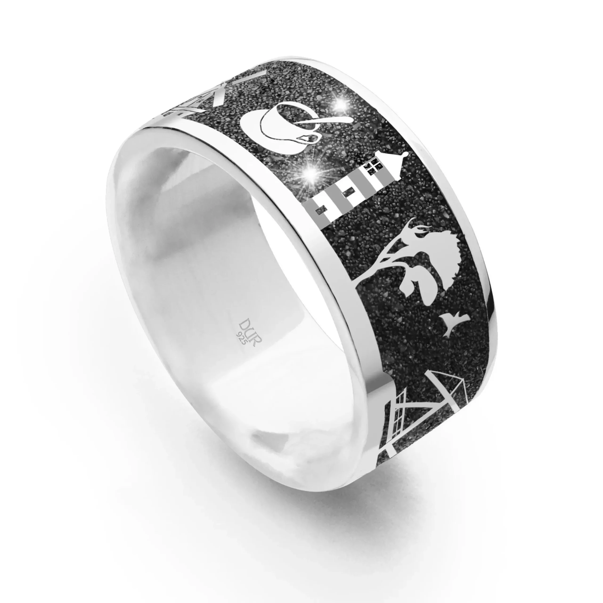 Wattenmeer, Nordsee und Tee – Ostfriesland fasziniert mit abwechslungsreicher Landschaft, sowie einmaligen Natur und Kulturschätzen. Als Erinnerung an schöne Urlaubsmomente, einen besonderen Lebensabschnitt, oder für alle die Ihre Verbundenheit zu Ostfriesland stilvoll zum Ausdruck bringen möchten, ist dieser elegante und zeitlose Nachtring ein unverzichtbarer Begleiter.Der glanzvolle Bandring verspricht höchsten Tragekomfort durch hochwertige Materialien und überzeugt durch sein klares Design, sowie eine hohe Symbolik, die ihn für jeden Tragenden einzigartig macht.Auf dem schwarzen Band des funkelnden Lavasands sind formschön verschiedene Motive eingearbeitet (Kuh (Wittmund), Windmühle (Aurich), Teetasse (Leer), Leuchtturm (Pilsum), Windflüchter (Norden), Möwe (Nordsee), Fehnbrücke (Wiesmoor)), welche die Vielfältigkeit der Region auf zauberhafte Weise einfangen.Der geschmackvolle Kontrast zwischen poliertem, rhodiniertem Silber, sowie dem tiefschwarz funkelndem Lavasand zieht alle Blicke auf sich und erinnert an eine sternenklare Nacht in Ostfriesland. Funkeln Sie mit diesem entzückenden Schmuckstück um die Wette und zeigen Sie, dass Ostfriesland eine Herzenssache ist.