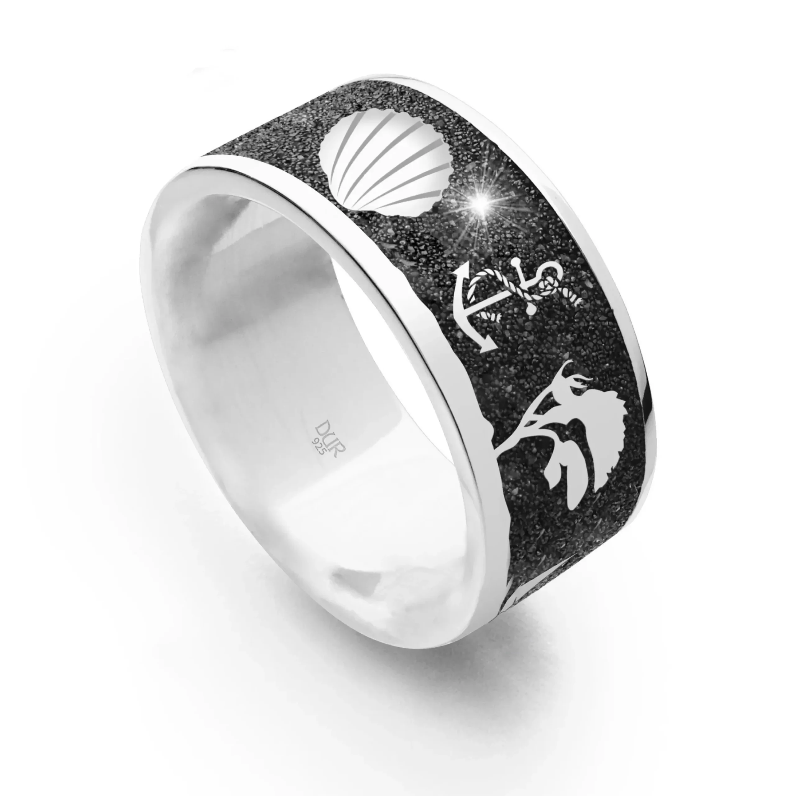 Sommer, Sonne, Strand und Meer – Die Ostsee fasziniert mit endlosen Sandstränden, idyllischen Seebädern und einzigartigen Naturschauspielen. Als Erinnerung an schöne Urlaubsmomente, einen besonderen Lebensabschnitt, oder für alle die Ihre Liebe zur Ostsee stilvoll zum Ausdruck bringen möchten, ist dieser elegante und zeitlose Nachtring ein unverzichtbarer Begleiter.Der glanzvolle Bandring verspricht höchsten Tragekomfort durch hochwertige Materialien und überzeugt durch sein klares Design, sowie eine hohe Symbolik, die ihn für jeden Tragenden einzigartig macht.Auf dem schwarzen Band des funkelnden Lavasands sind formschön verschiedene Motive eingearbeitet (Möwe, Leuchtturm, Strandkorb, Muschel, Anker, Windflüchter, Segelboot), welche die Vielfältigkeit der Ostsee auf zauberhafte Weise einfangen.Der geschmackvolle Kontrast zwischen poliertem, rhodiniertem Silber, sowie dem tiefschwarz funkelndem Lavasand zieht alle Blicke auf sich und erinnert an eine sternenklare Nacht an der Ostsee. Funkeln Sie mit diesem entzückenden Schmuckstück um die Wette und tragen Sie immer einen Teil der Ostsee ganz nah bei sich.
