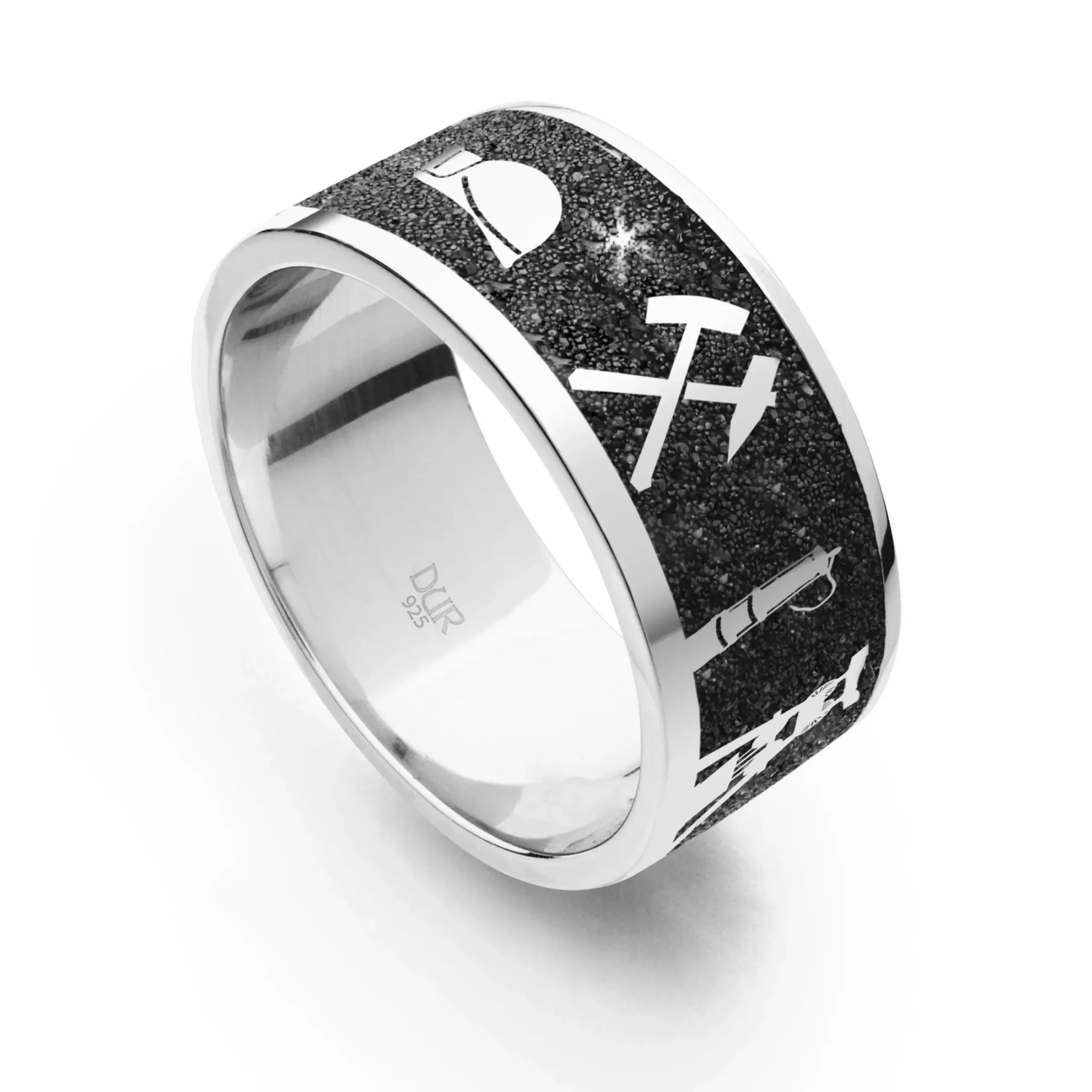 „Glück auf“ – Der Ruhrpott fasziniert mit zahlreichen Industriedenkmälern, eindrucksvoller Natur und vielfältiger Kultur. Als Erinnerung an einen schönen Aufenthalt, einen besonderen Lebensabschnitt, oder für alle, die Ihre Verbundenheit zum Ruhrpott stilvoll zum Ausdruck bringen möchten, ist dieser elegante und zeitlose Nachtring ein unverzichtbarer Begleiter.Der glanzvolle Bandring verspricht höchsten Tragekomfort durch hochwertige Materialien und überzeugt durch sein klares Design, sowie eine hohe Symbolik, die ihn für jeden Tragenden einzigartig macht.Auf dem schwarzen Band des funkelnden Lavasands sind formschön verschiedene Motive eingearbeitet (Lohre, Grubenhelm, Schlägel und Eisen, Grubenlampe, Förderturm, Gravur „Glück auf“), welche die Vielfältigkeit des Lebens im Ruhrgebiet auf zauberhafte Weise einfangen.Der geschmackvolle Kontrast zwischen poliertem, rhodiniertem Silber, sowie dem tiefschwarz funkelndem Lavasand zieht alle Blicke auf sich und erinnert an eine sternenklare Nacht im „Pott“. Funkeln Sie mit diesem entzückenden Schmuckstück um die Wette und tragen Sie immer einen Teil Ihrer Stadt ganz nah bei sich.