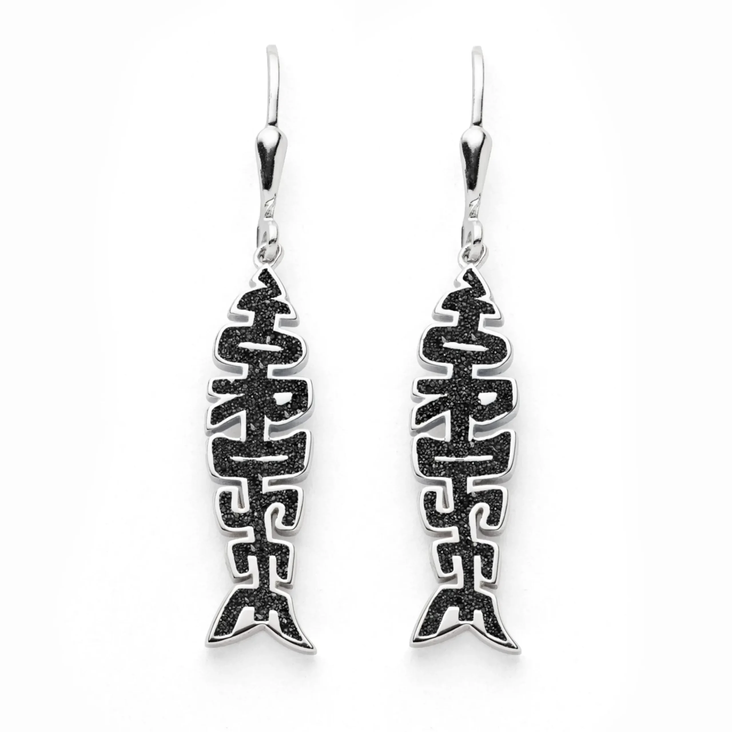Ohrhänger Fischgräte mit „Nordsee“- Schriftzug in Fischform, gefüllt mit Lavasand und alles aus poliertem, rhodiniertem 925er Sterlingsilber.