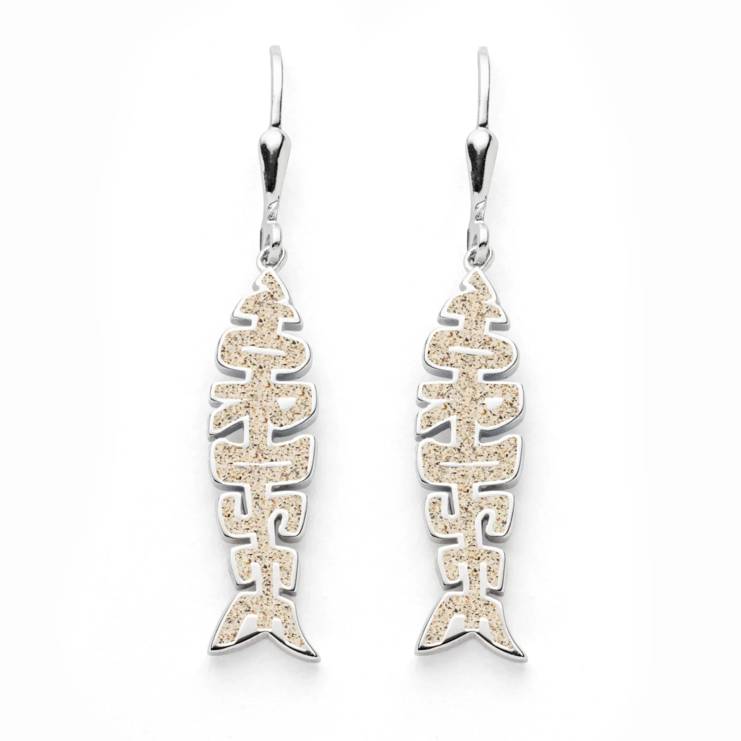 Ohrhänger Fischgräte mit „Nordsee“- Schriftzug in Fischform, gefüllt mit Strandsand und alles aus poliertem, rhodiniertem 925er Sterlingsilber.