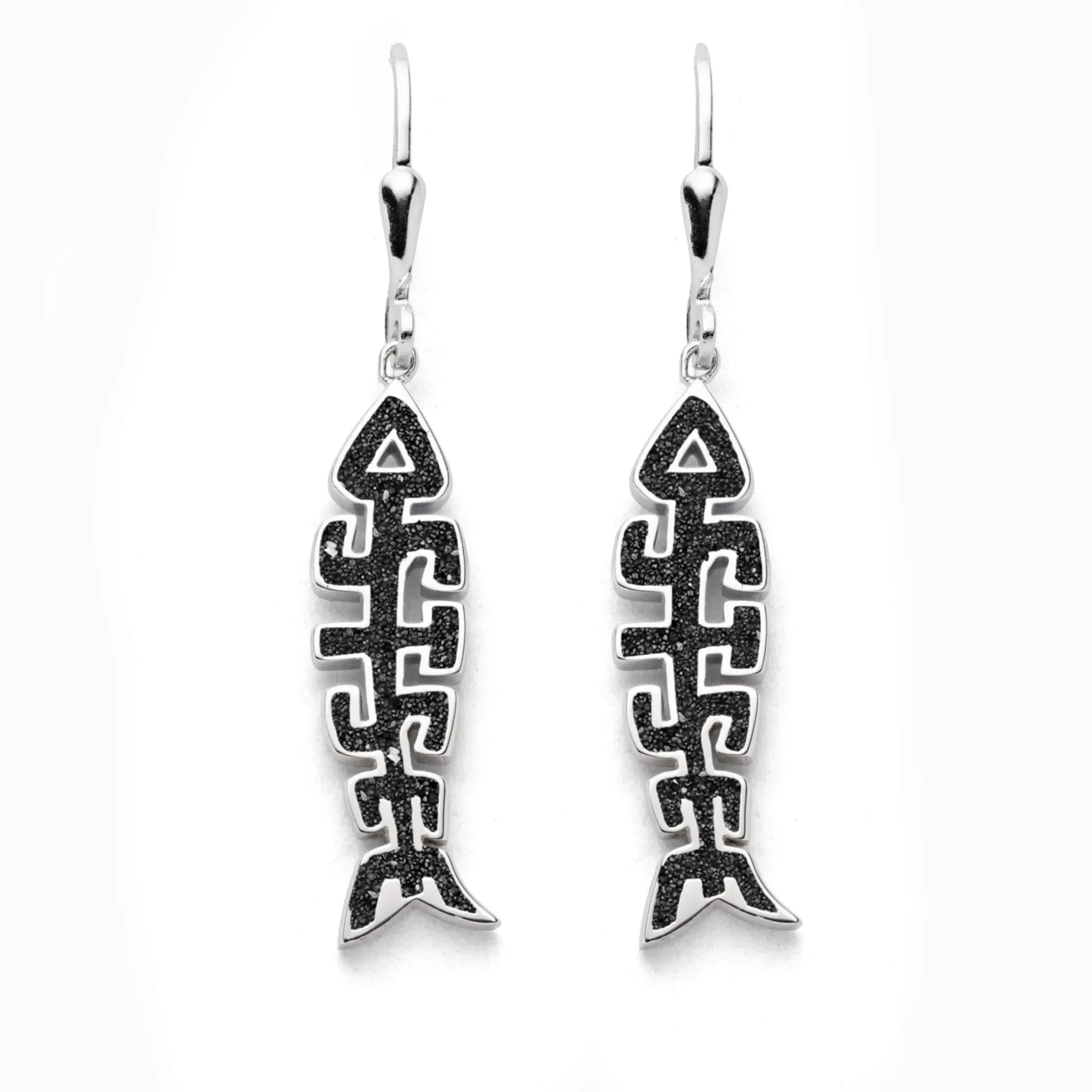 Ohrhänger Fischgräte mit „Ostsee“- Schriftzug in Fischform, gefüllt mit Lavasand und alles aus poliertem, rhodiniertem 925er Sterlingsilber.