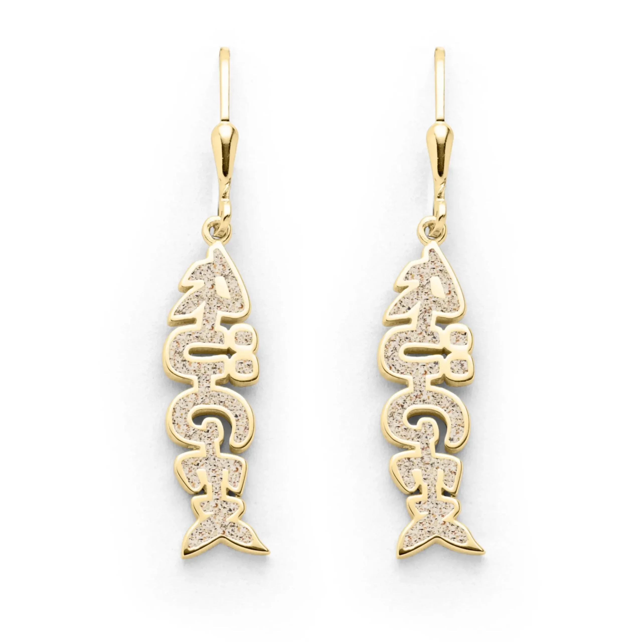 Ohrhänger Fischgräte mit „Rügen“- Schriftzug in Fischform, gefüllt mit Strandsand und alles aus poliertem, vergoldetem 925er Sterlingsilber.