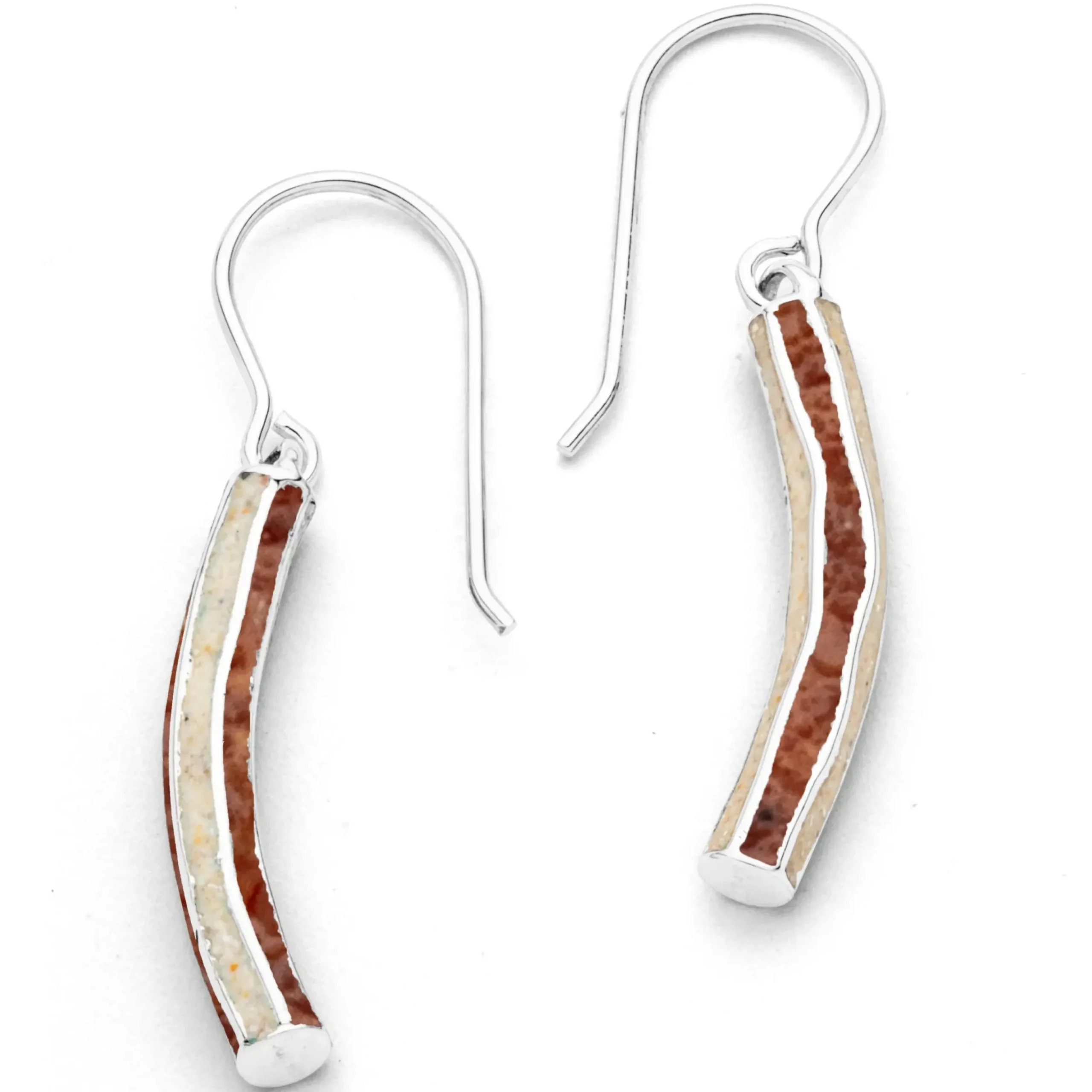Ohrhänger „Wellenspiel“, handgefertigt, mit leicht geschwungenen Elementen, wechselweise gefüllt mit Strandsand und Bernsteinsand, alles aus rhodiniertem 925er Sterlingsilber