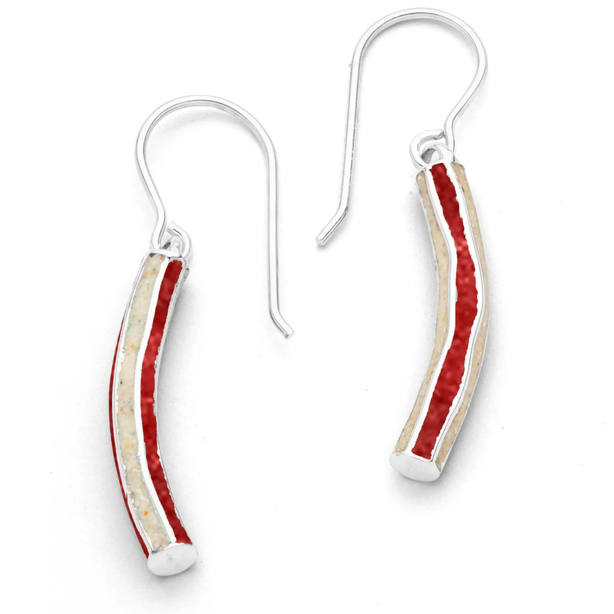 Ohrhänger „Wellenspiel“, handgefertigt, mit leicht geschwungenen Elementen, wechselweise gefüllt mit Strandsand und Korallengranulat, alles aus rhodiniertem 925er Sterlingsilber