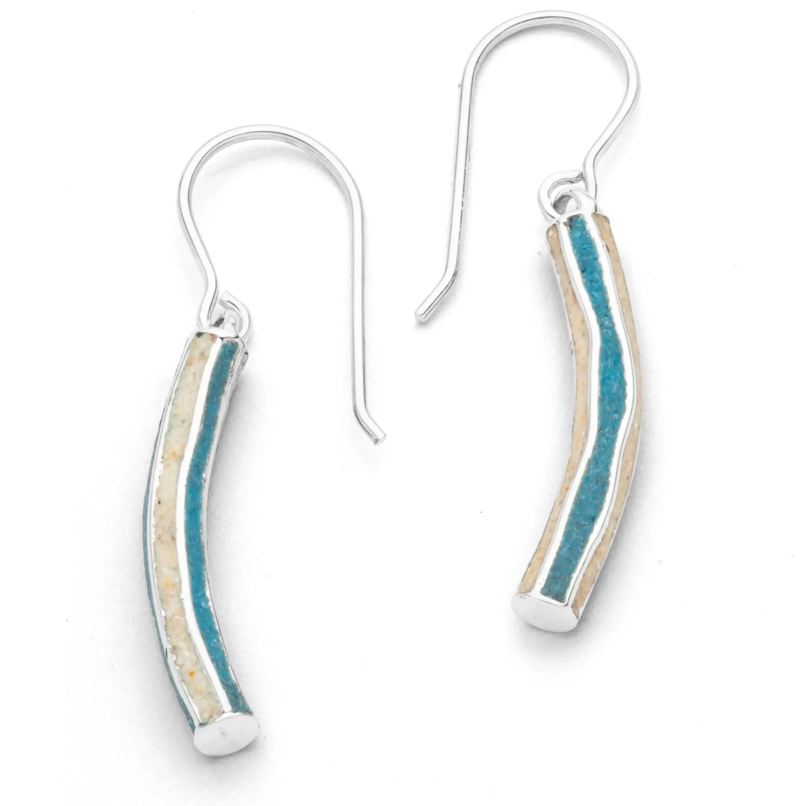 Ohrhänger „Wellenspiel“, handgefertigt, mit leicht geschwungenen Elementen, wechselweise gefüllt mit Strandsand und blauem Steinsand, alles aus rhodiniertem 925er Sterlingsilber