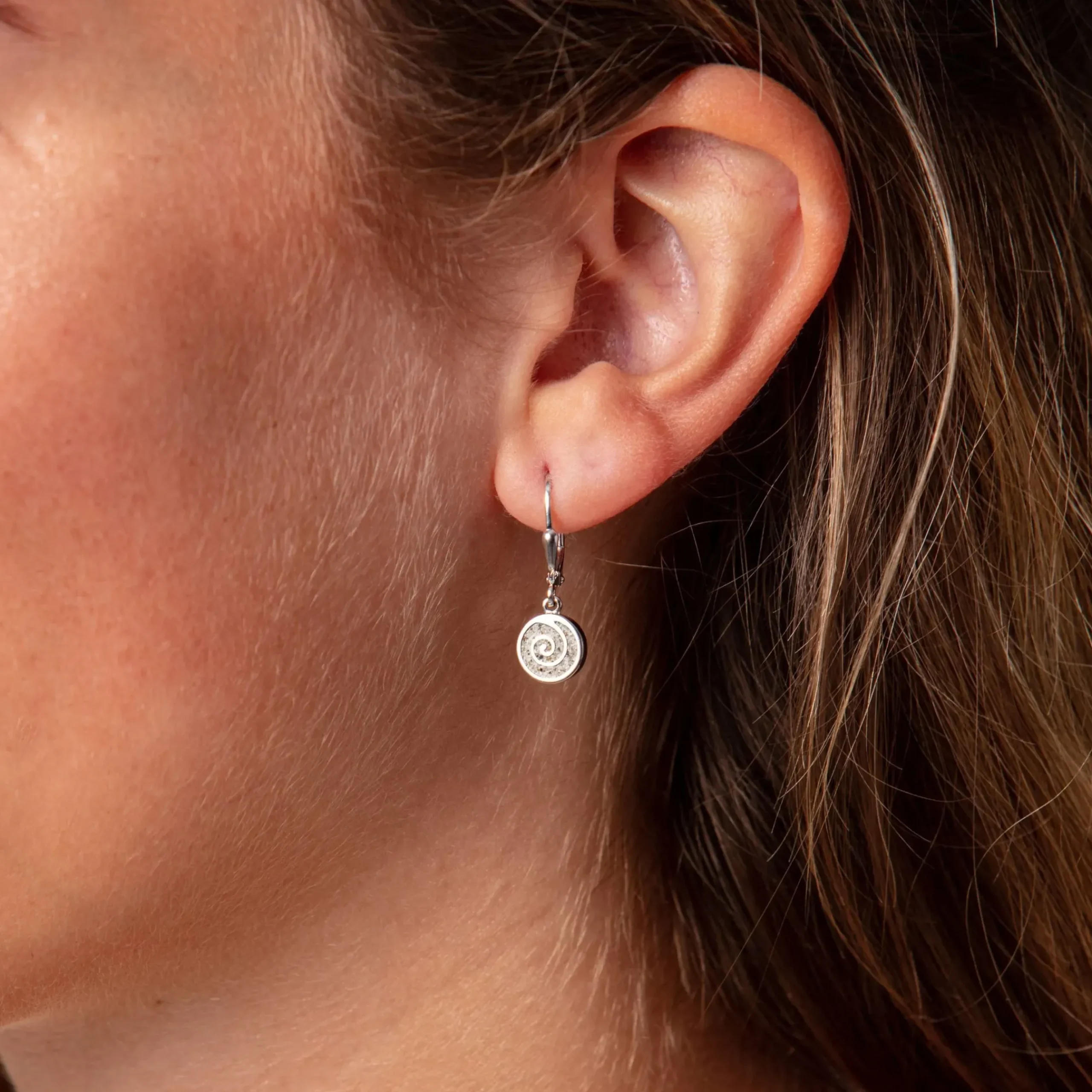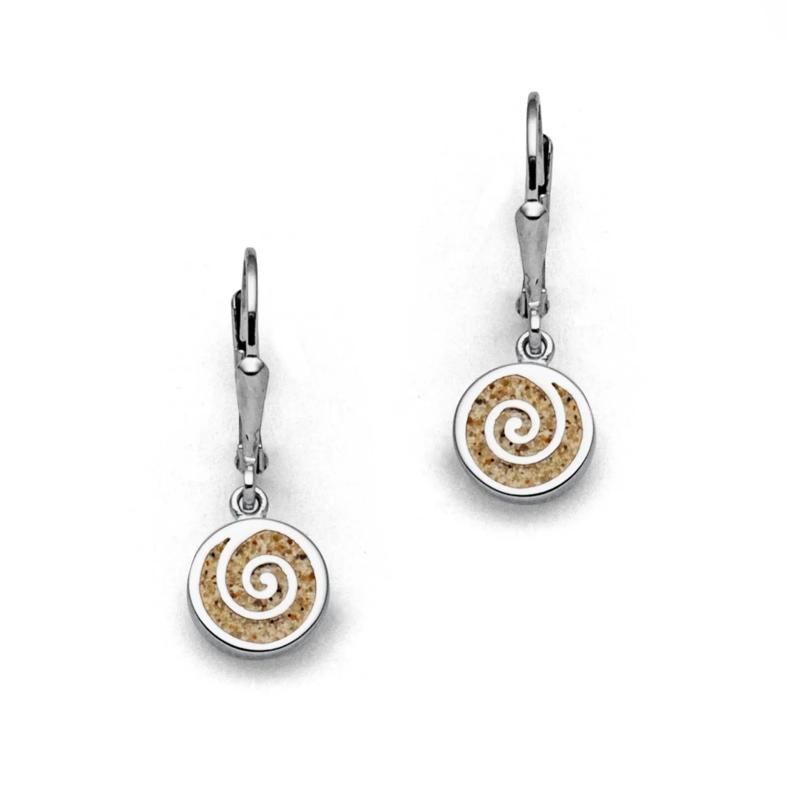 Ohrhänger „Sandspirale 2.0“, runder, flacher Ohrhänger gefüllt mit Strandsand und einer eingearbeiteten Spirale gefasst in rhodiniertem 925er Sterling-Silber