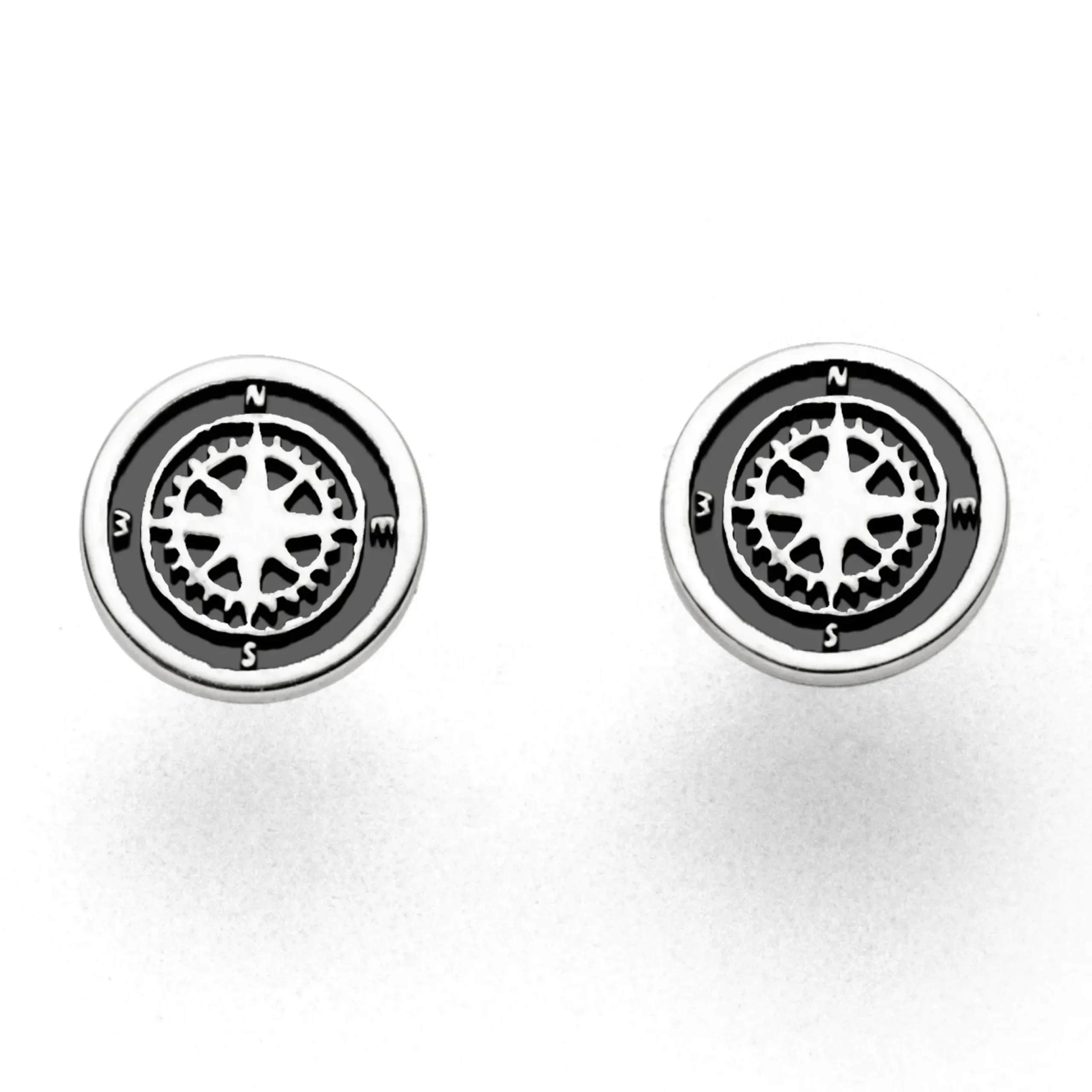 Ohrring „Kompass“, kleiner runder Ohrstecker mit einer Kompassrose, innen dunkel rhodiniert, gefaßt in rhodiniertem 925er Sterlingsilber. Durch die Rhodinierung ist das Schmuckstück anlaufgeschützt.