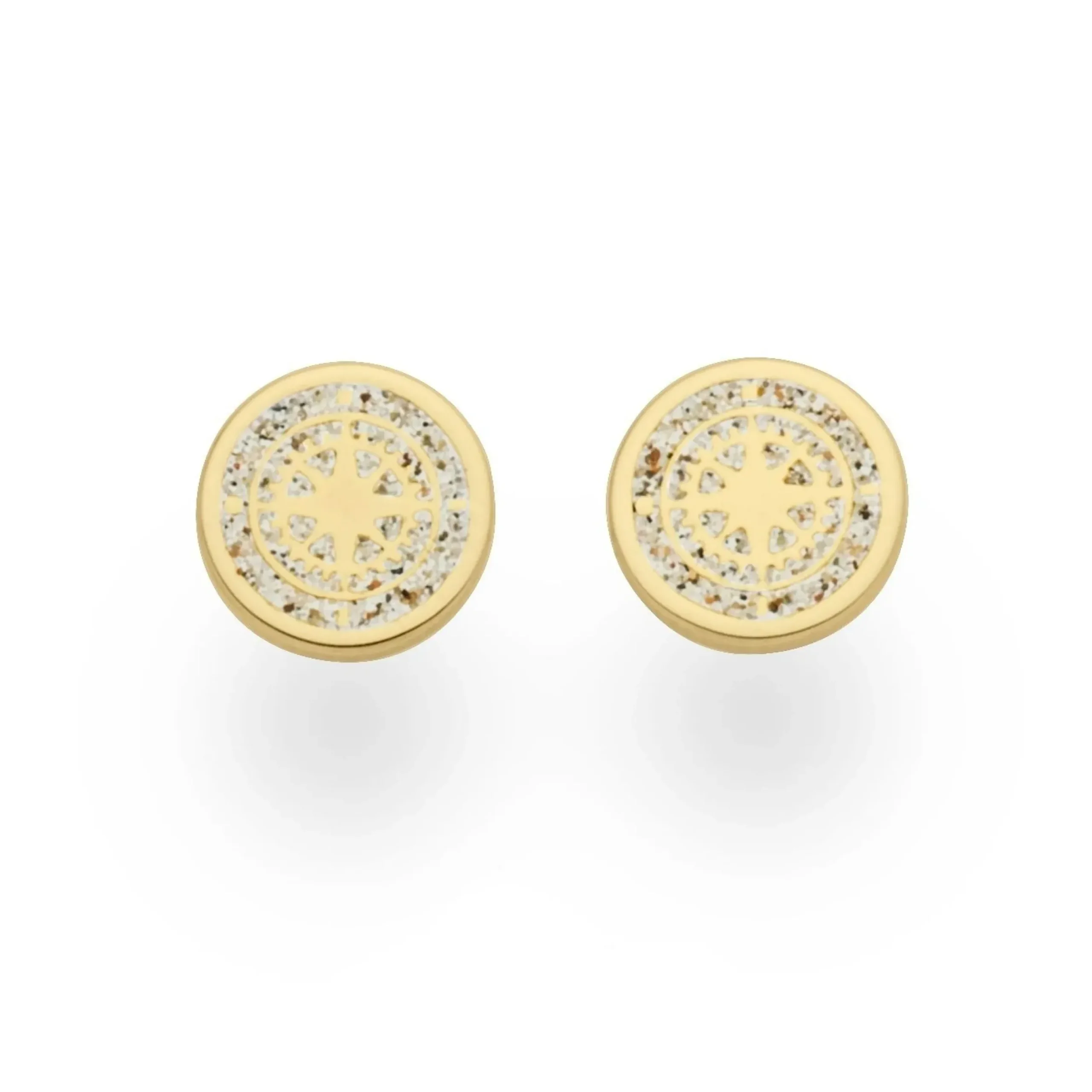 Ohrring „Kompass“, kleiner runder Ohrstecker mit einer in Strandsand eingebetteten Kompassrose, gefaßt in vergoldetem 925er Sterlingsilber.