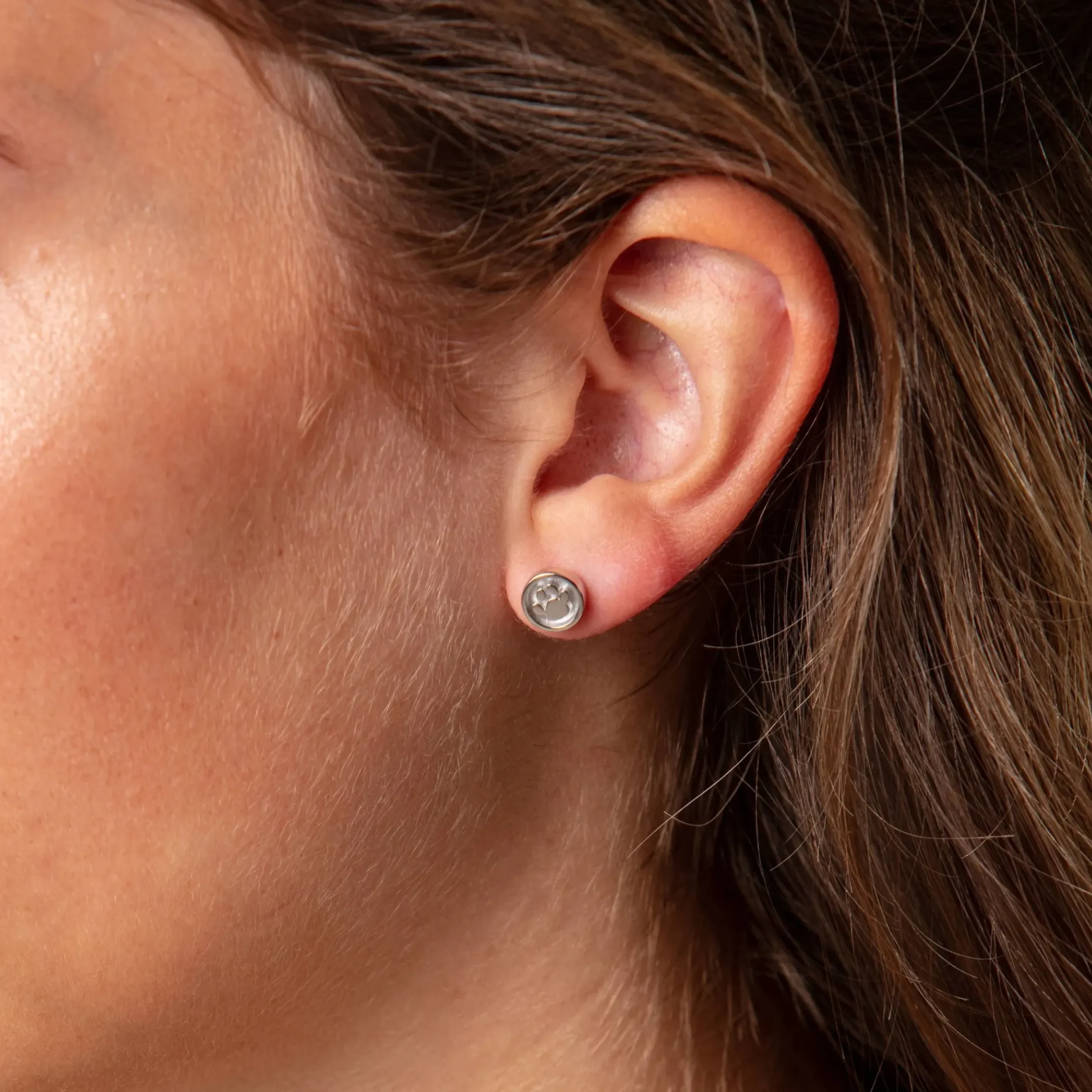 Ohrring „Lucky Dog“, kleiner 8 mm runder Ohrstecker mit dem Motiv: Hundepfote, innen mattiert, gefaßt in rhodiniertem 925er Sterlingsilber.