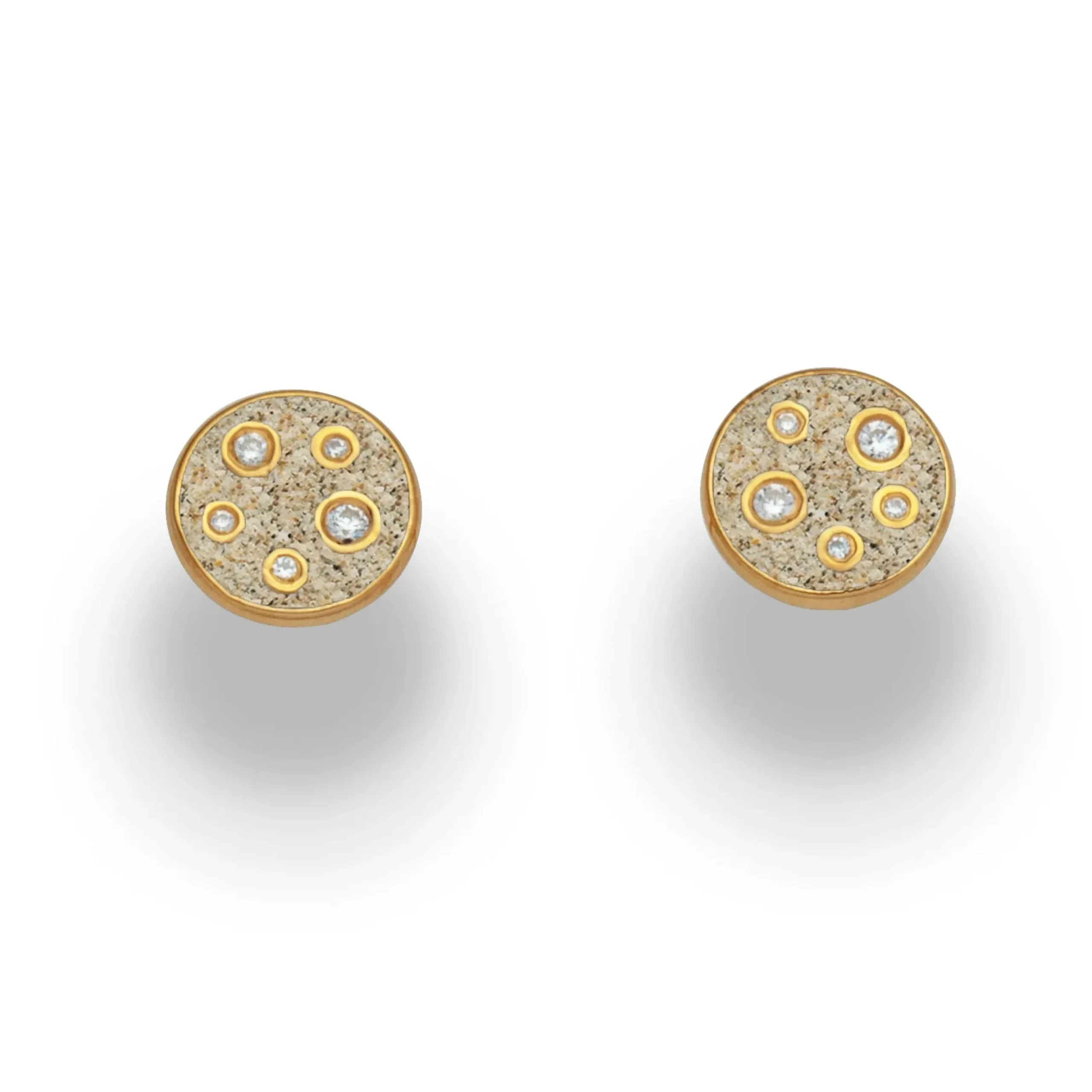 Ohrring „Monaco“, runder Ohrstecker mit Strandsand gefüllt und Zirkoniasteinen in verschiedenen Größen besetzt, aus vergoldetem 925er Sterlingsilber