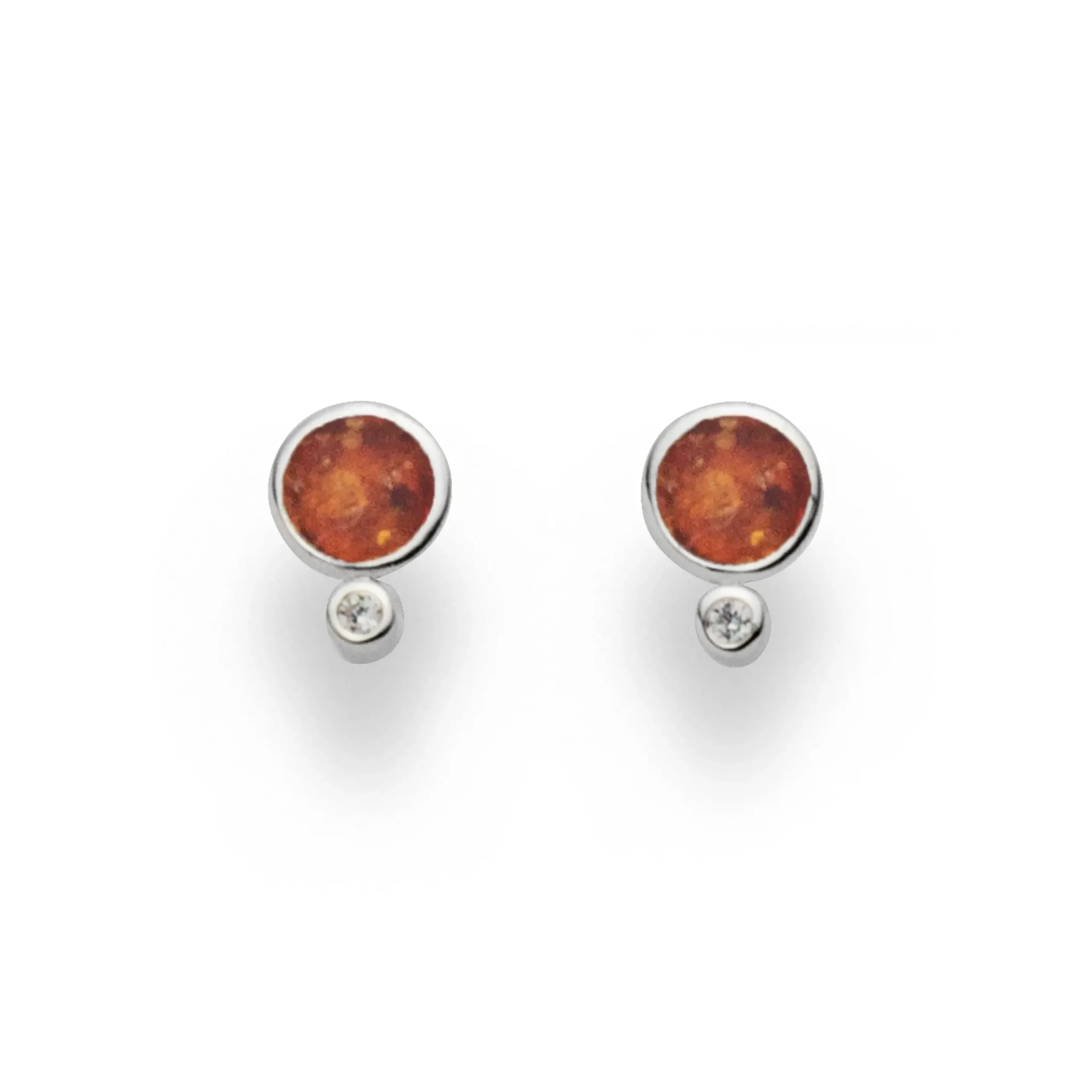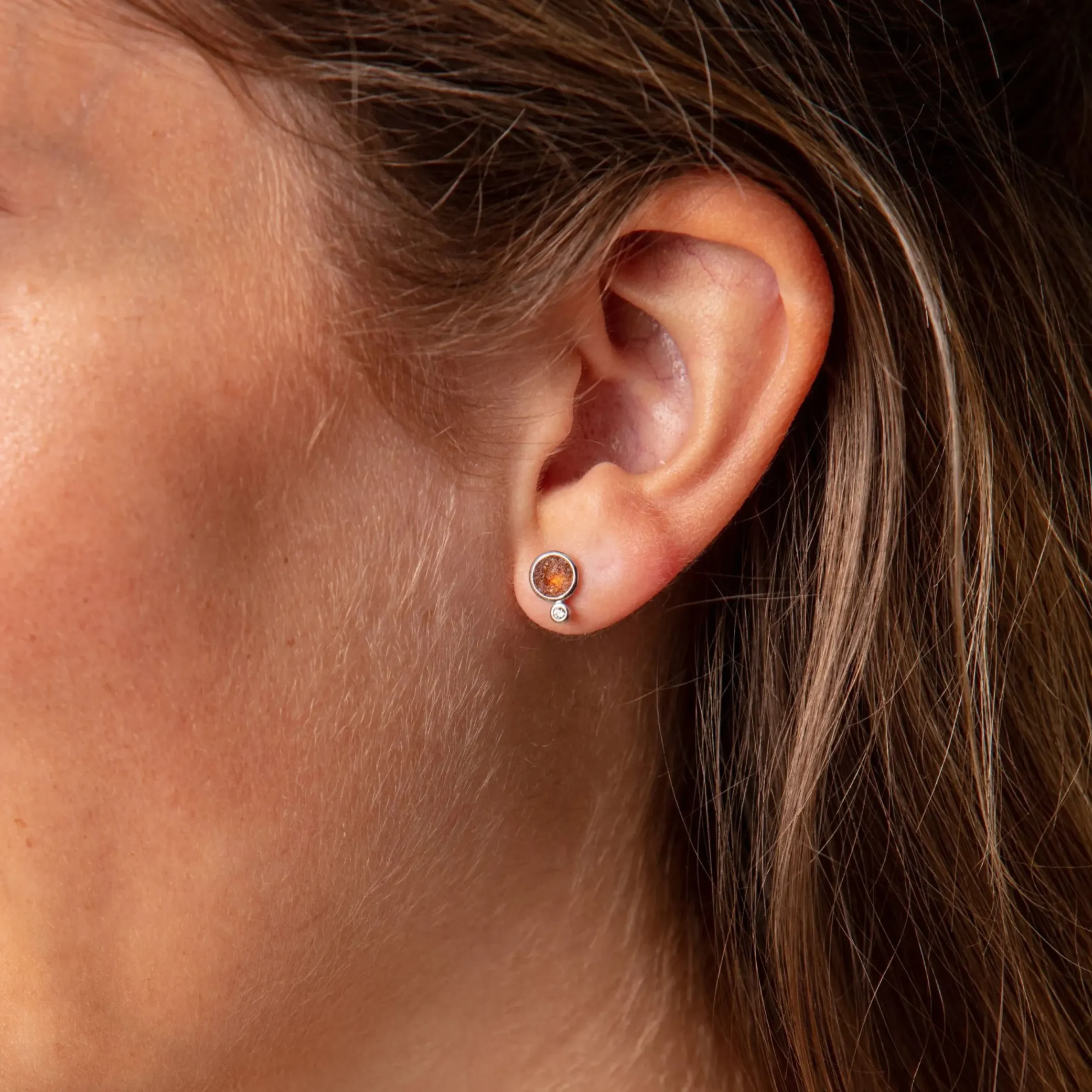 Zierlicher, runder Ohrring „Polarstern“, gefüllt mit Bernstein, der durch die Kombination mit einem kleinen Zirkoniastein am unteren Rand wie ein „Polarstern“ erstrahlt. Alles gefasst in rhodiniertem 925er Sterlingsilber. Durch die Rhodinierung ist das Schmuckstück anlaufgeschützt.