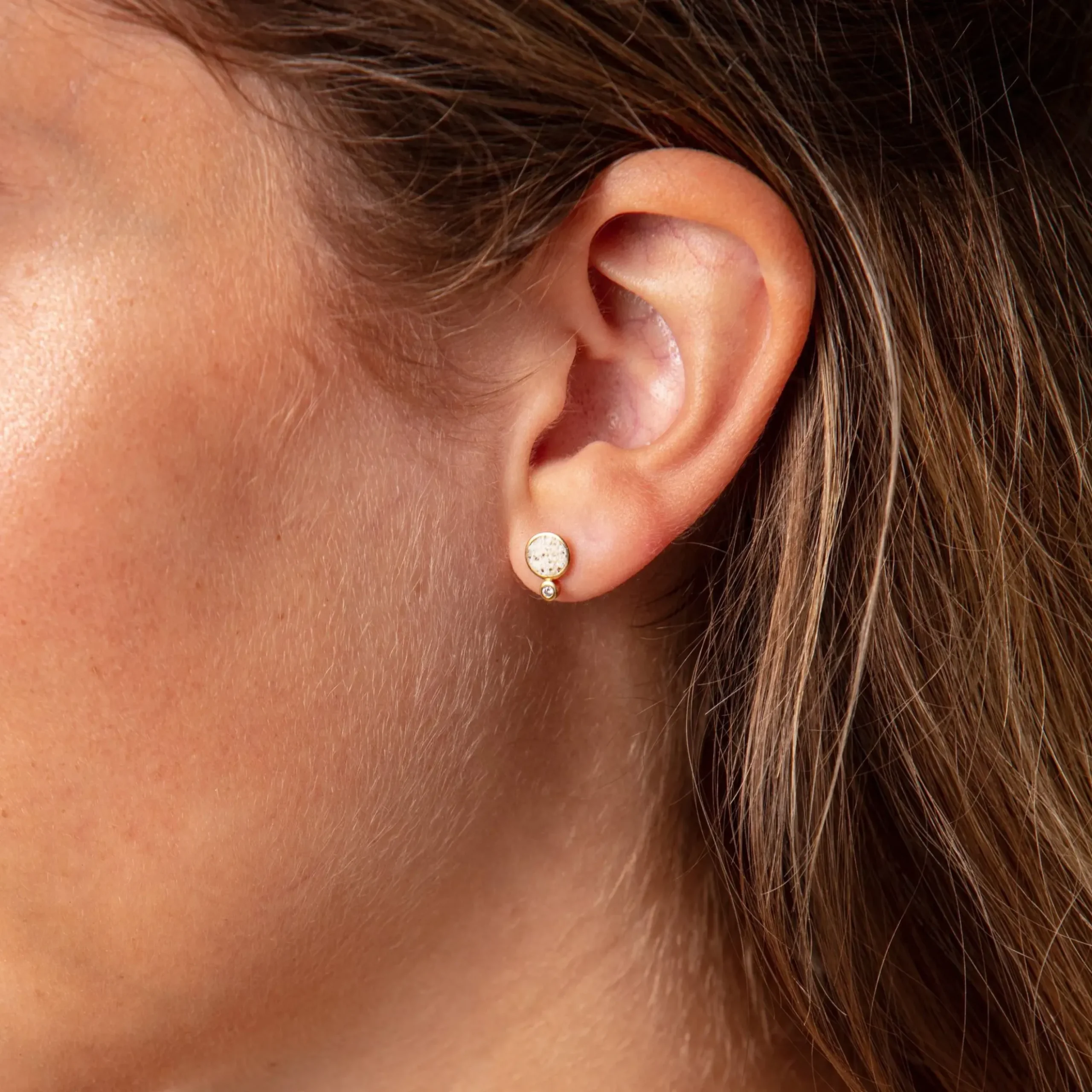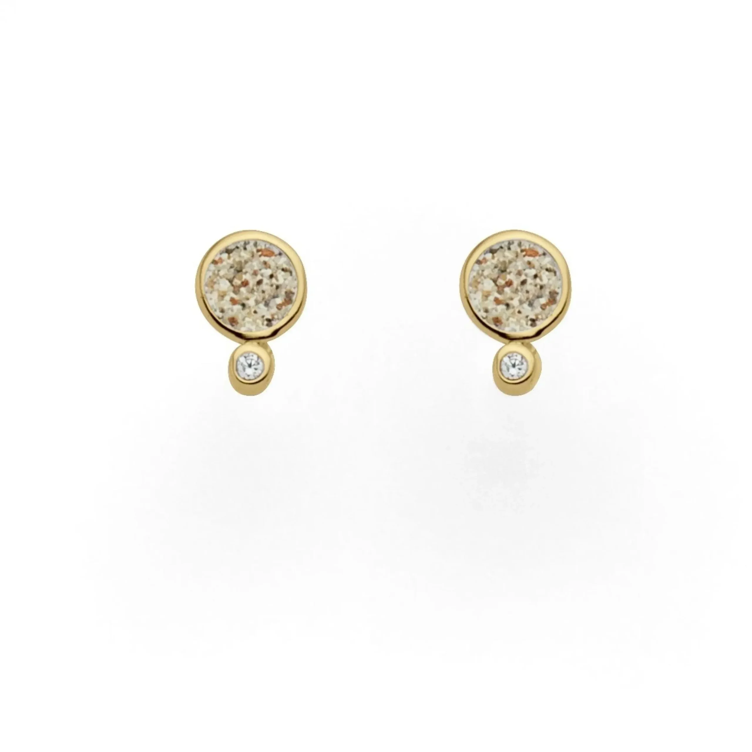 Zierlicher, runder Ohrring „Polarstern“, gefüllt mit Strandsand, der durch die Kombination mit einem kleinen Zirkoniastein am unteren Rand wie ein „Polarstern“ erstrahlt. Alles gefasst in vergoldetem 925er Sterlingsilber.