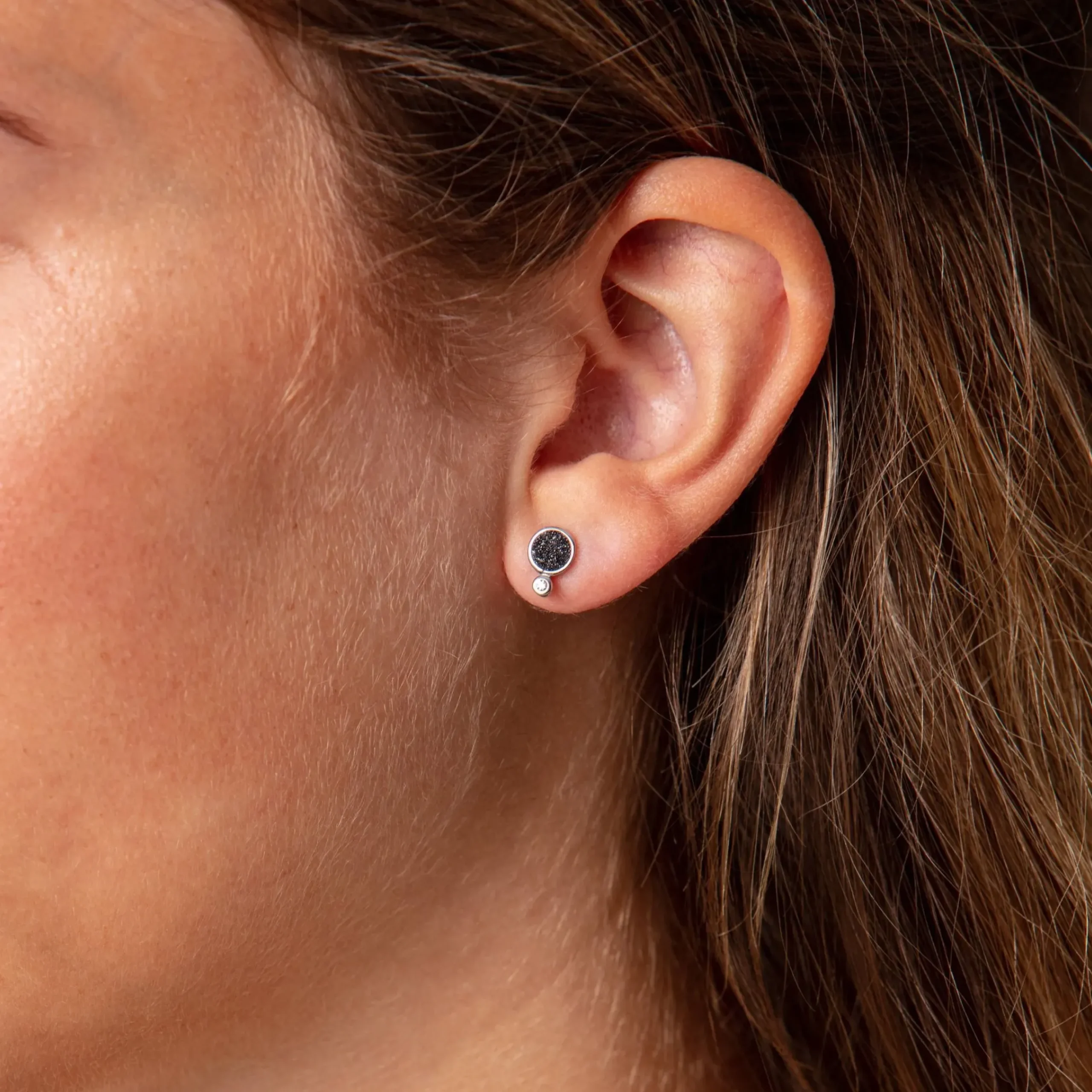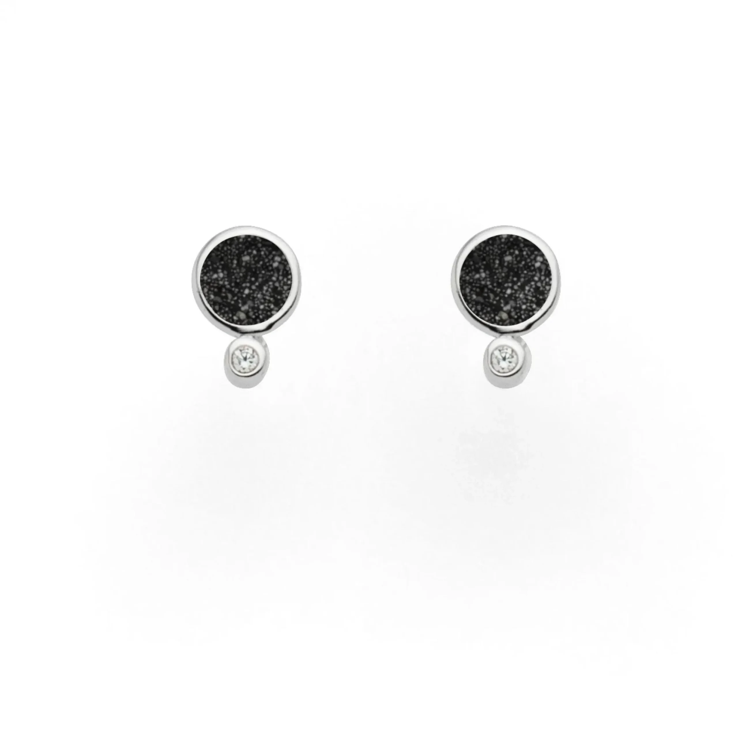 Zierlicher, runder Ohrring „Polarstern“, gefüllt mit Lavasand, der durch die Kombination mit einem kleinen Zirkoniastein am unteren Rand wie ein „Polarstern“ erstrahlt. Alles gefasst in rhodiniertem 925er Sterlingsilber. Durch die Rhodinierung ist das Schmuckstück anlaufgeschützt.
