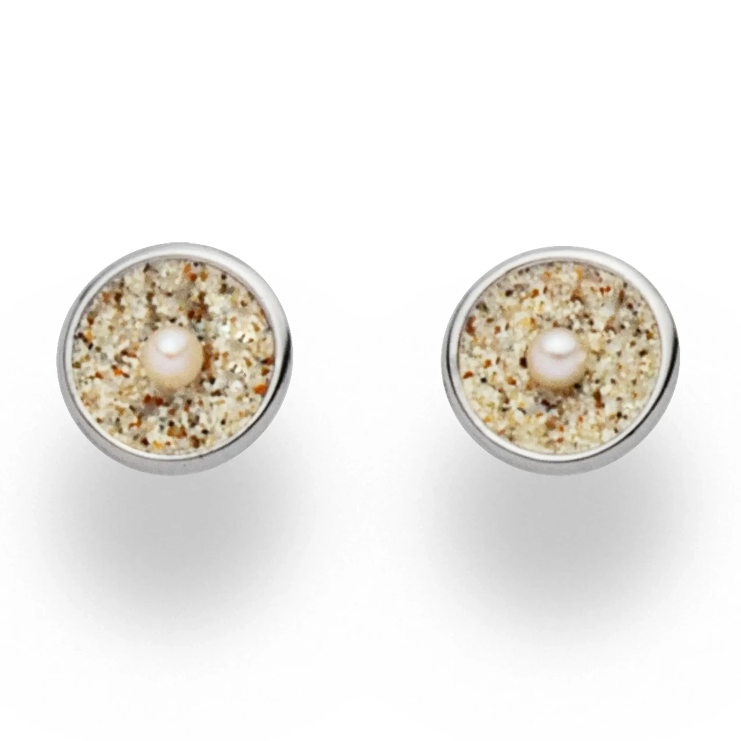 Kleiner runder Ohrstecker „Sandschale“, gefüllt mit Strandsand und einer mittig eingesetzten Süßwasserperle. Gefasst in rhodiniertem 925er Sterling-Silber. Durch die Rhodinierung ist das Schmuckstück anlaufgeschützt.